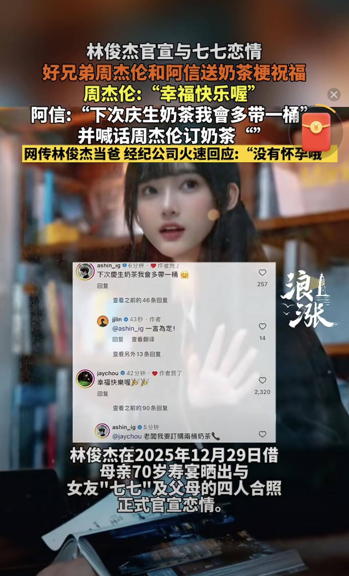 林俊杰官宣小21岁女友,阿信在官宣动态下幽默留言:“下次庆生奶茶我会多带一桶。”
