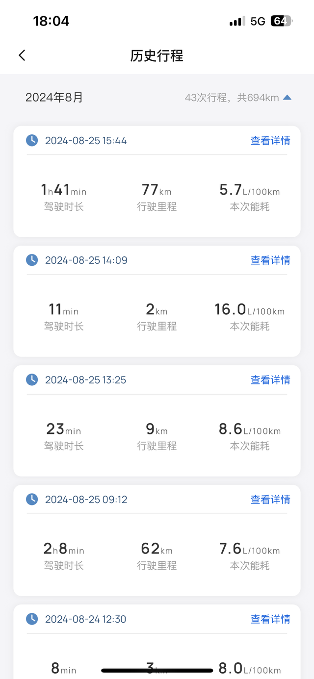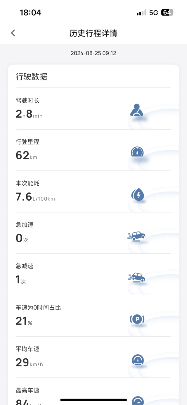 今日从广州花都跑佛山 早上没走高速,行驶62公里,时长2h8min,平均油耗7.6/百公里,回程走部分市区+高速,行驶77公里,时长1h41min,平均油耗5.7/百公里,有图有真相!没有激烈驾驶,最高车速没超100,油耗还算满意,公里数越大,越真实,市区一两公里的那种可能油耗会去到10-20个,我觉得也没有参考价值!