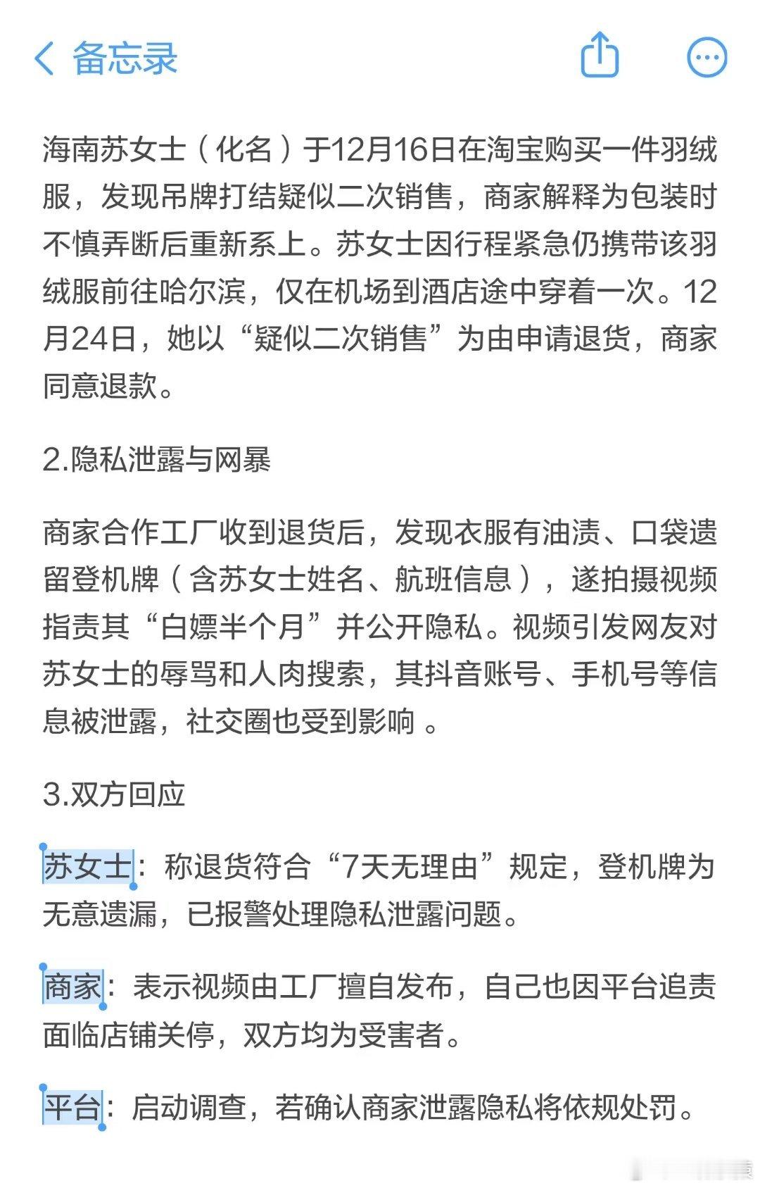 退货羽绒服兜里有机票买家否认白嫖苏女士否认白嫖,表示只穿过一次,是在下飞机到回酒店的路上,如果是这样,那苏女士应该是带了两件羽绒服或者在哈尔滨买了一件羽绒服,不然在哈尔滨的这几天太挨冻了。