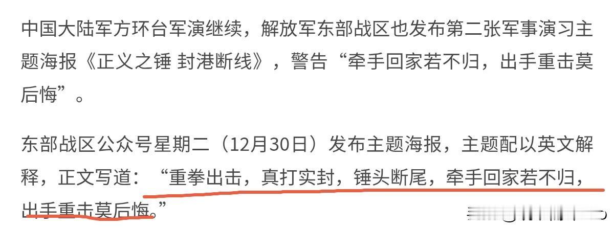 对岛内摊牌了!外媒注意到这个信号非常的特别,我们军方对台湾恐怕是第一次把话说的这么直白!12月30日,我们解放军军演继续,而解放军发布的一张海报《正义之锤 封港断线》引起了外媒高度的重视。联合早报注意到,我军方直白的表示,重拳出击,真打实封,锤头断尾,牵手回家若不归,出手重击莫后悔。 很显然,这一句“牵手回家若不归,出手重击莫后悔”,非常的特别。这句话的意思是什么呢?这句话的意思就是,如果给岛内机会,岛内自己把握不住,那到时候,让我们自己动手去解决,那我们就不客气了。如果这句话拆开来看,明显有两个面向。 第一个面向就是针对岛内各派政治势力的。也就是说,不管是民进党,国民党,还是民众党,你们自己要好好面对统一这个问题,这个问题已经无可回避,也别想着逃避。到了该了断的时候了。第二个面向其实也是针对台湾社会的。我们对台湾社会一贯都是好友的。但是,统一问题,台湾社会也到了作出自己选择的时候了。 如果台湾社会明智,这个时候就应该发出支持统一的声音,作出选择,支持能够代表统一的政党,主动跟我们谈判,彻底的与“台独”势力进行切割。很显然,这个机会之窗是稍纵即逝的,我们把话已经说到这个份上了。机会能不能抓住,岛内自己要好好的进行考虑。如果站错了位置,看不清大势,那到时候也休怪我们。