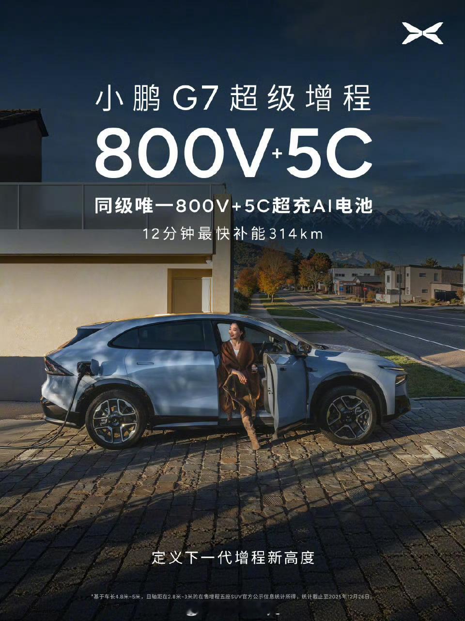 1704公里超长续航SUV小鹏G7来了小鹏G7超级增程版综合续航1704公里,纯电续航430公里。这得益于55.8kWh大电池+60L大油箱的组合设计。800V高压平台配合5C超充技术,12分钟就能补充314公里续航,这个充电速度确实解决了电动车的主要痛点。增程器使用92号汽油,馈电油耗仅5.9L/100km,用车成本控制得不错。6kW 对外放电则是那种“你未必天天用,但用过一次就回不去”的配置。露营、户外、临时应急电源,都不是噱头,尤其对有孩子、有周末出游需求的家庭来说,实用性很高。大v聊车汽场全开