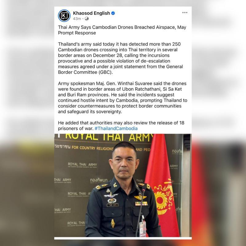 葫芦案!泰国军方声称“发现超过250架无人机从柬埔寨领空进入泰国”!从这简短的一句话,可以分析三方面的内容,首先是数量不少,比乌克兰方面袭击普京官邸的91架无人机还要多。其次是泰国方面并没拦截的消息,不排除已经被击落,第三是时间节点非常敏感,就在刚刚停火的两天内,这明摆着是要搞事,或者离间。实际上,从柬埔寨官方层面来看,好不容易刚刚达成停火协议,而且他们处于弱势一方,没有理由再次挑起冲突,不排除柬埔寨国内有反对力量在暗中搞小动作。