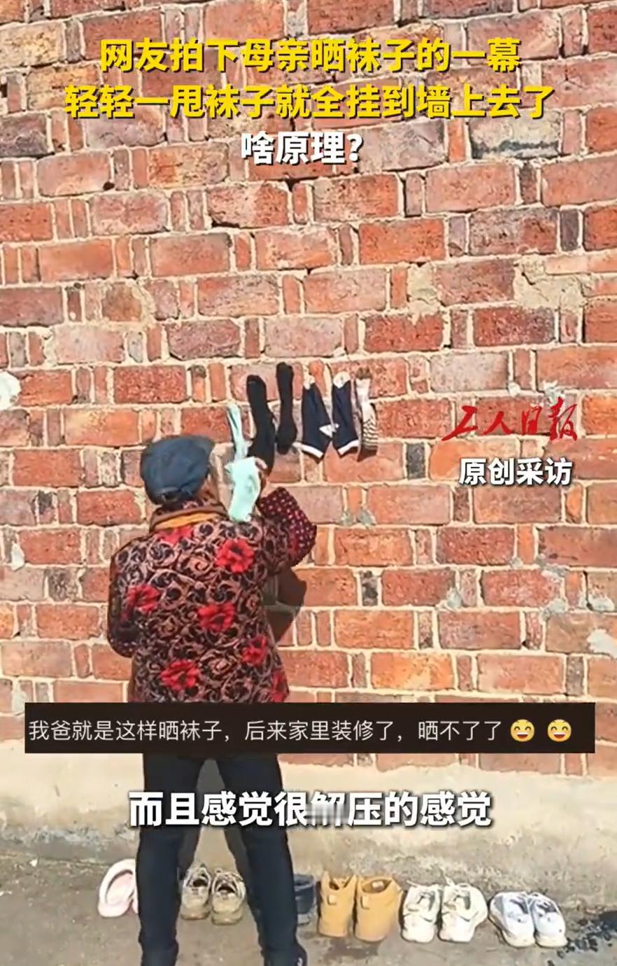 这是啥原理?湖南湘潭,男子在院里待着,偶然发现老母亲晒袜子的方式很特别,别人都是挂在衣架上面,可母亲却随手一甩,就能把袜子甩到墙上,他想了好久,也没想出这其中的原理 视频中,老母亲手里拿着刚刚洗好的袜子,将袜子往粗糙的砖墙上一甩,袜子便牢牢挂住,仿佛施展了奇妙魔法,这种“贴烧饼”式的晒袜场景也让他很好奇 后来他表示,并非只有腈纶袜子才能挂在墙上,普通袜子同样可以做到,而且袜子干了之后也不会掉落,只需到墙上直接收走即可,小时候看邻居也这样晒,但现在只有母亲还在这样做,觉得很有趣,很解压,就是不知道是什么原理 说起来,这个原理并不复杂,关键在三个点。袜子是湿的,有水,墙是粗糙的,有凹凸。甩出去那一下,袜子被拉开,水分被挤进墙面的缝隙里,空气被挤走,贴上去的一瞬间就形成了很小范围的吸附力。再加上砖墙表面不平,袜子的纤维会卡在细小的凸起上,摩擦力一上来,就稳了。等水慢慢蒸发,袜子变轻,纤维收缩,反而更贴墙,不容易掉 这道理不复杂,甚至有点简单,但特别有意思。它不是什么高科技,就是生活里长出来的智慧。这种智慧有个前提:你得有一面向阳的、粗糙的砖墙,还得有在院子里不慌不忙晾晒生活的日子 所以现在这法子少见了吧。我们住的楼房,外墙是光滑的涂料或瓷砖,室内墙面刮得平整,你甩一个试试?立马滑下来 评论里挺多人操心:墙上不脏吗?这不白洗了? 我猜,会这么用的人,心里都有谱。过去的砖墙,淋过雨,晒过太阳,脏也脏得自然。这么晾的,都是天天洗换的贴身小件,图的就是个顺手、省事