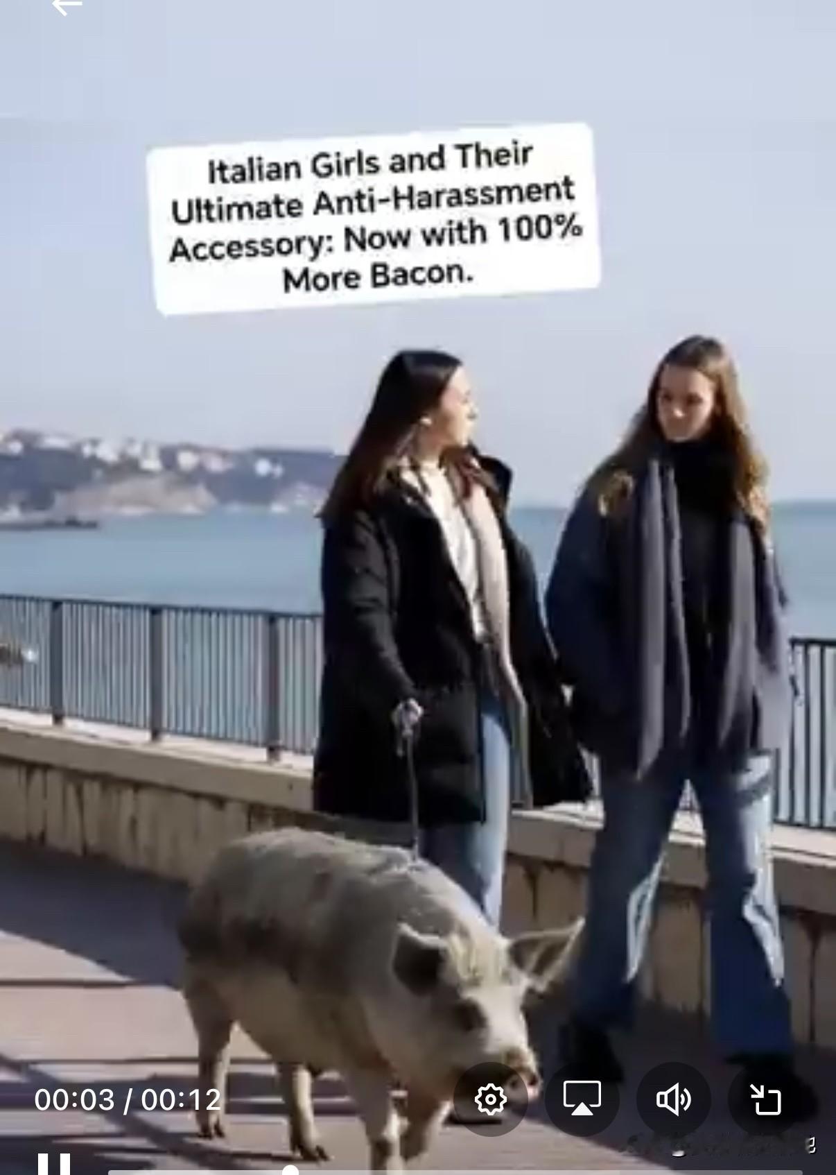 防色狼辣椒喷雾器不管用,意大利女孩们改用宠物猪防身。她们不堪忍受持续不断的骚扰,于是效仿法国的做法,祭出了“终极生物威慑”:战术宠物猪。 如果当局不保护妇女,妇女就会保护自己。她们的保护方式富有创造性、非暴力且有效。建议每个欧洲女孩都应该随身携带一只小猪,然后再训练一条狗。猪和比特犬或许能拯救欧洲 养宠物猪的主意不错,不过不太实用。其实可以随身携带几袋猪油,必要时用猪油喷侵犯者。