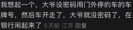 我想起一个,大爷设密码用门外停的车的车牌号,然后车开走了,大爷就没密码了,在银行闹起来了