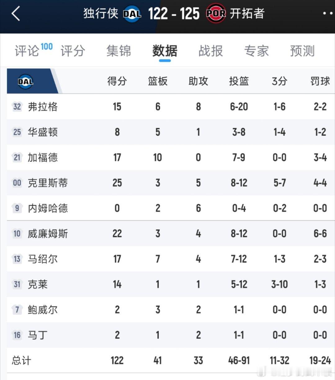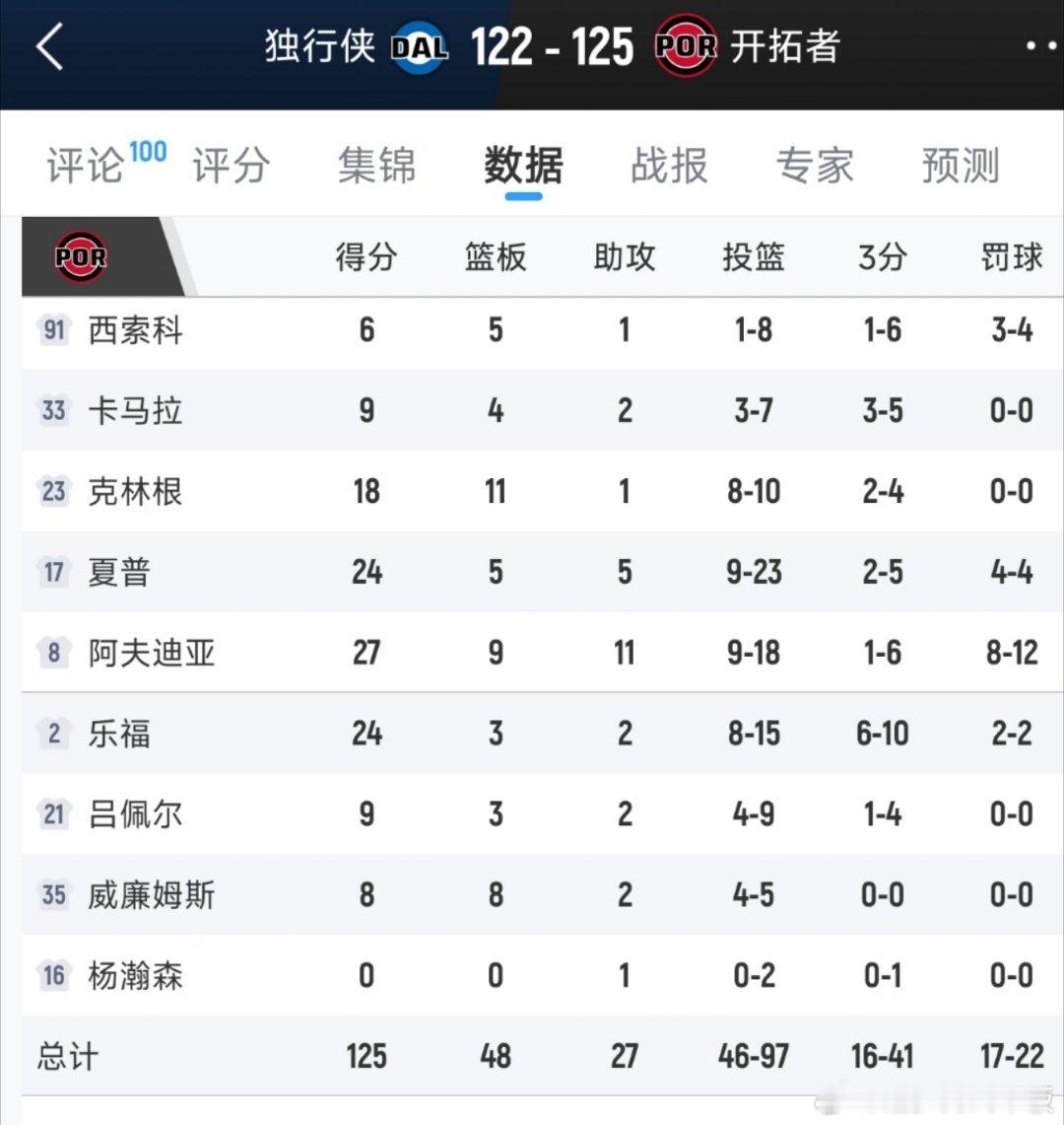 独行侠客场122-125不敌开拓者,遭遇3连败。克里斯蒂25分,弗拉格15分;阿夫迪亚27分9板11助,凯勒布-乐福24分独行侠vs开拓者