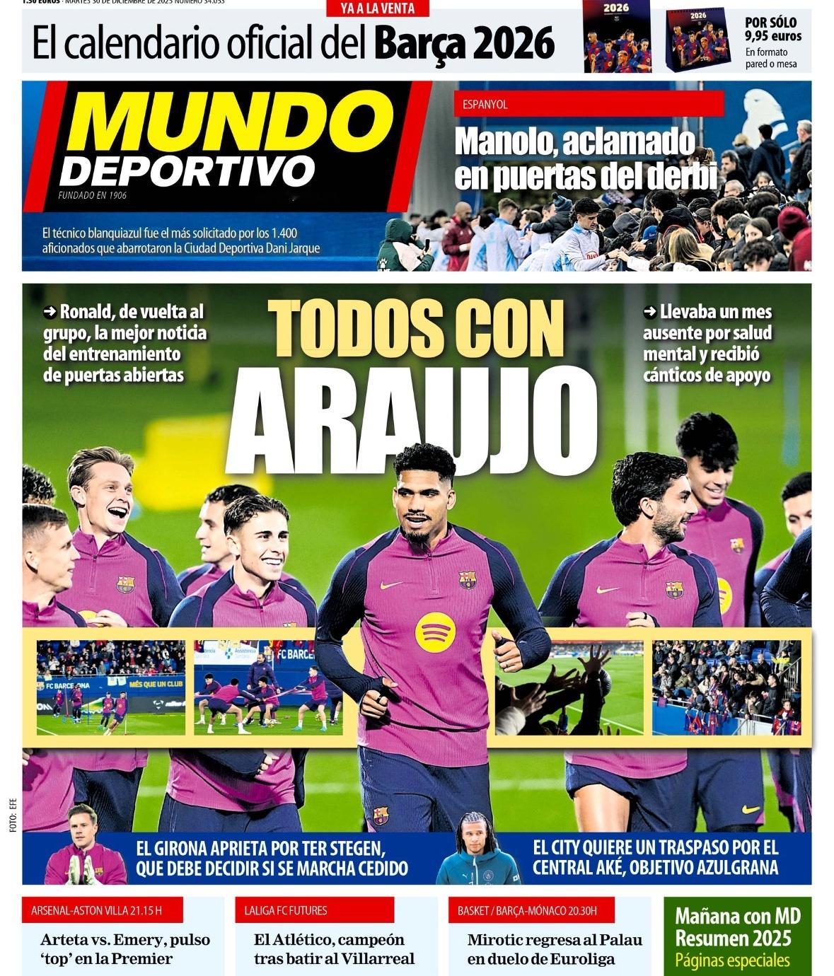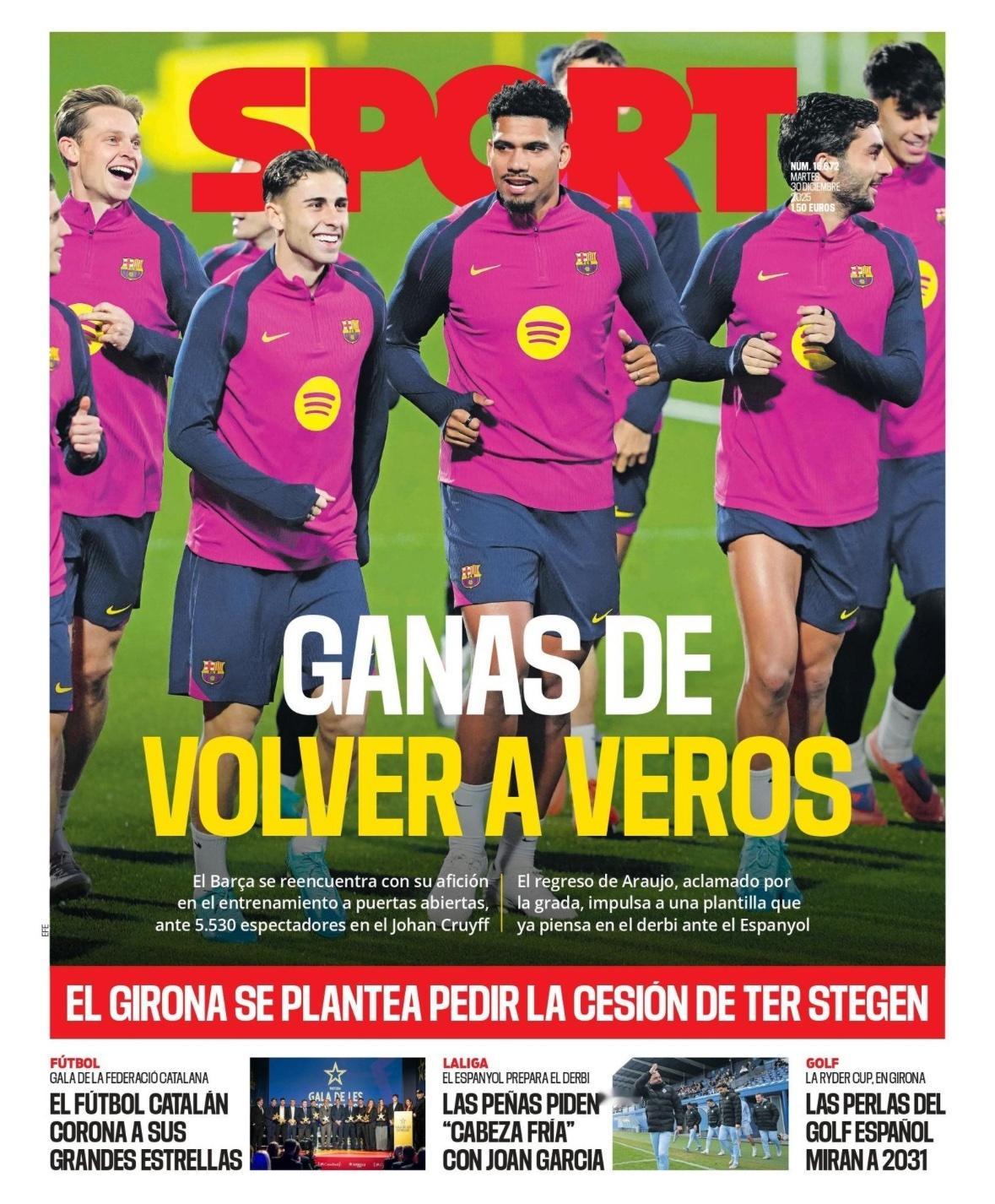 每体封面:渴望再次相聚 巴塞罗那重返赛场,在约翰·克鲁伊夫体育场举行了一场公开训练课,与球迷见面,共有 5530 名观众到场观战。 阿劳霍的回归赢得了看台上球迷的掌声和欢呼,极大地鼓舞了球队的士气,他们已经开始考虑与西班牙人的德比大战了。 赫罗纳正在考虑申请租借特尔施特根。世体:全部与阿劳霍在一起 →罗纳德回归球队是球迷们在公开训练课上听到的最好的消息。 →他因心理健康原因缺席了一个月,并受到了热烈的支持。体育大赏巴萨至死不渝红蓝魂