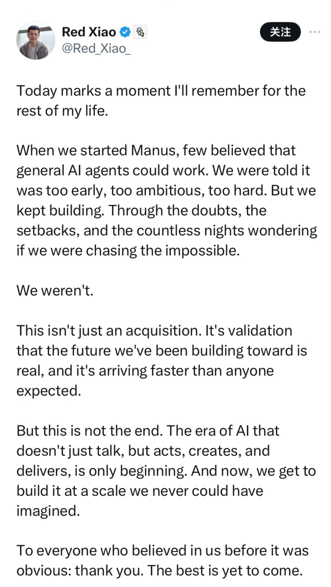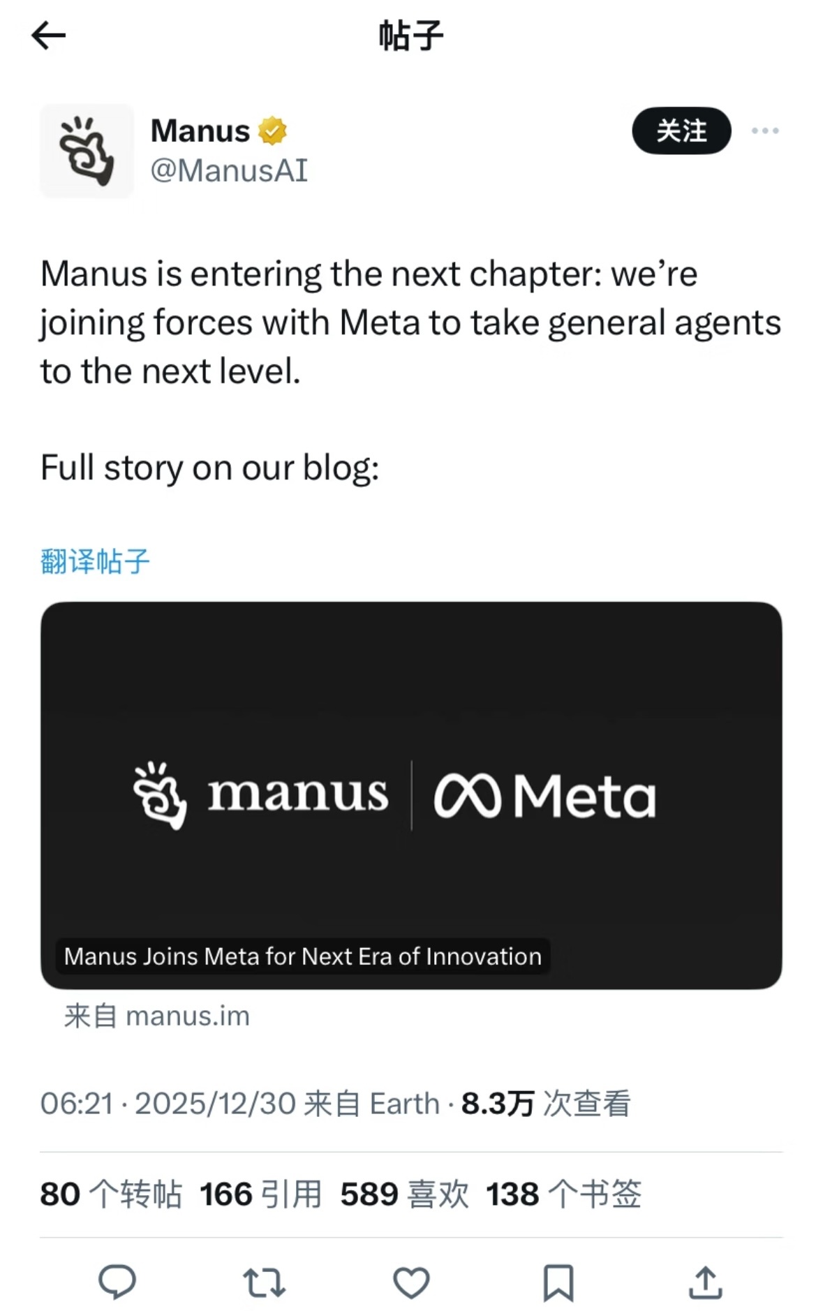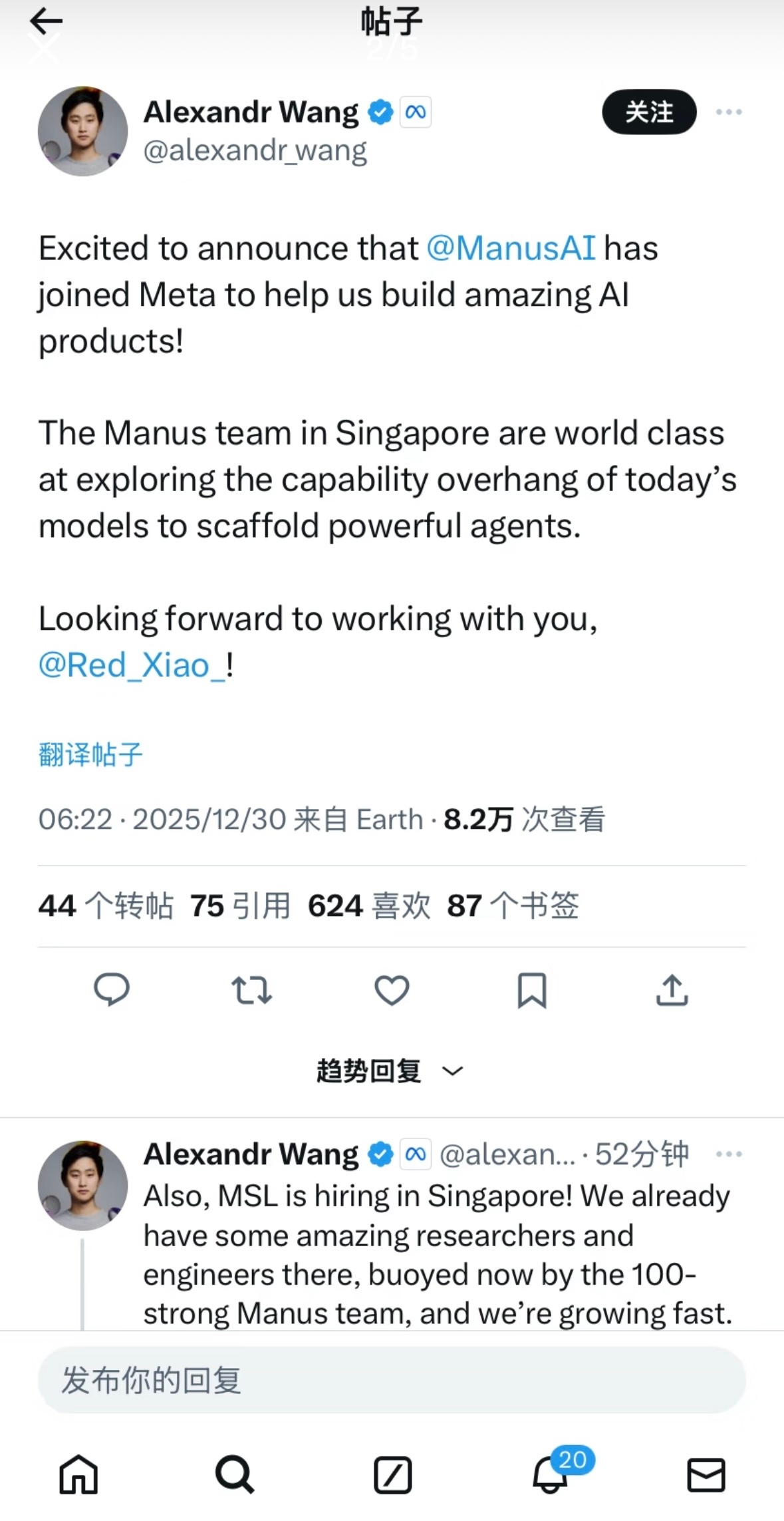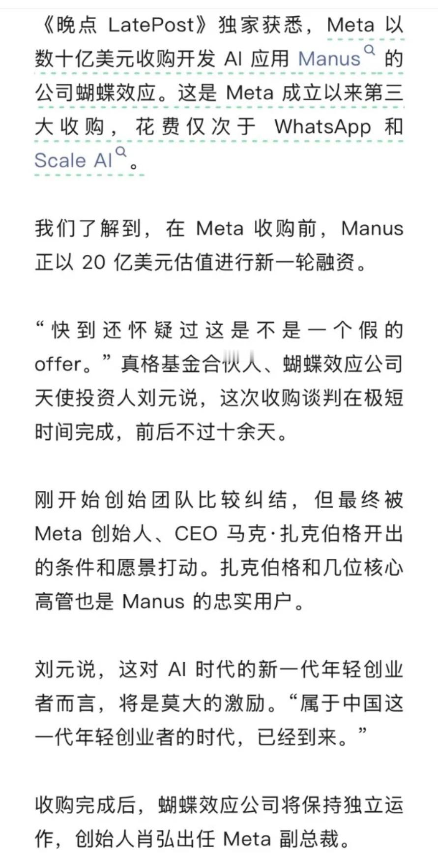Alexandr Wang在推上宣布Meta 收购 manus。Meta继续在Ai上砸钱,先是天价挖Ai研究员,再是买Ai应用。《晚点 LatePost》独家:Meta 以数十亿美元收购开发 Al 应用 Manus的公司“蝴蝶效应”。这是 Meta 成立以来第三大收购,花费仅次于 WhatsApp 和 Scale AI。见证Ai创业者进入新时代。