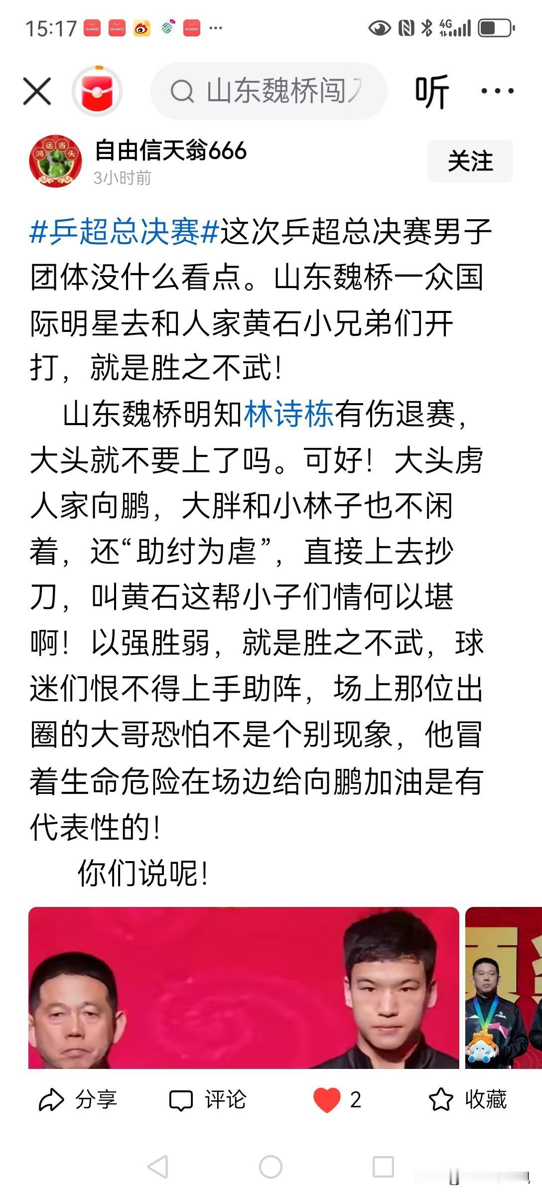 山东魏桥胜之不武? 有网友说山东魏桥对黄石基地胜之不武。NoNoNo!相反,山东魏桥夺冠实至名归。 都知道山东魏桥的当家花旦王楚钦有伤,但他不想以退赛结束2025年的赛事,说明了他重视这场比赛,说明了他不想让观众失望。 试想,孙颖莎不参赛,王曼昱决赛缺阵,林诗栋不参赛,樊振东回不来,就这现状,如果王楚钦再不上场,那这乒超联赛还有什么看头?观众会买帐么? 另外,既然是比赛,就要讲究排兵布阵,就得拿出看家本领,黄石基地有顶梁柱不用那是你们的事,输了就是输了,不能事后诸葛亮。要是换种结局,林诗栋没上都赢了,是不是又得把黄石基地吹上天啊? 所以,这次,我站王楚钦,我站山东魏桥,山东魏桥夺冠,实至名归!