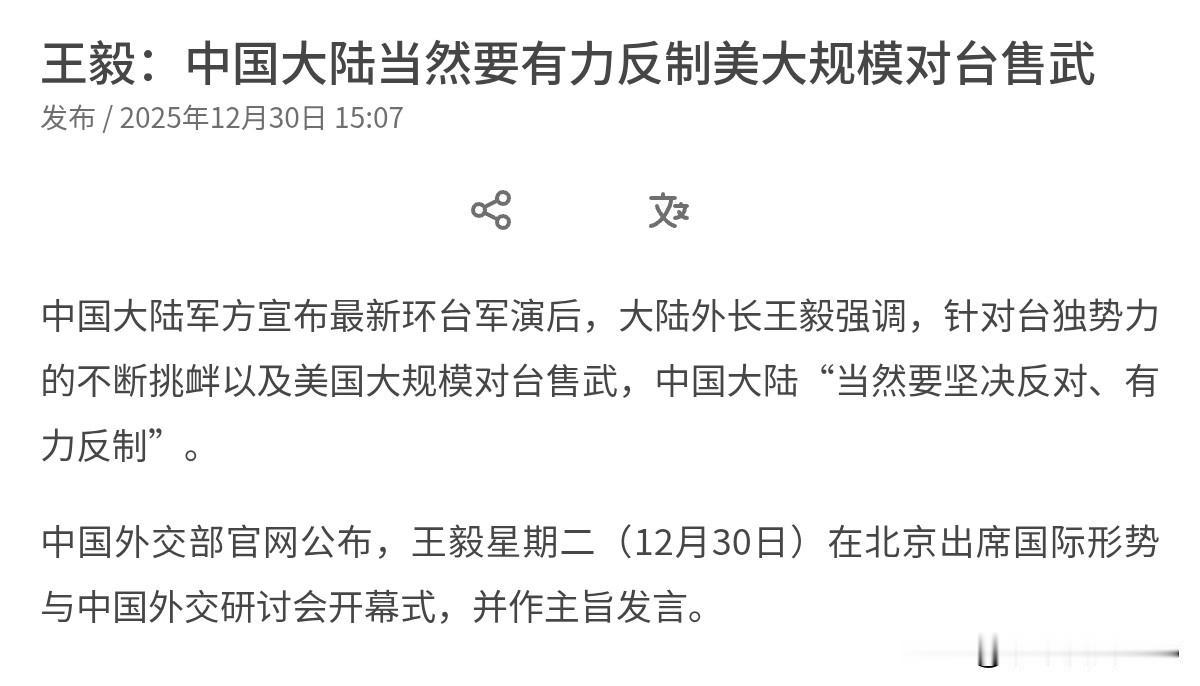 王毅外长把话说的很直白,明确点名美国!12月30日,王毅外长表示,台湾问题是中国的内政,是中国核心利益中的核心。针对“台独”势力的不断挑衅以及美国大规模对台售武,中国大陆当然要坚决反对、有力反制。我们坚持从自身与世界的整体和长远利益出发看待和处理对美关系,在重大原则问题上立场坚定、态度鲜明,在涉及中国核心利益的问题上针锋相对、寸步不让。 很显然,王毅外长喊话美国,把我们的意思传递的很清晰,一句话,台湾问题极度敏感,美国应该谨言慎行,切勿低估我们解决台湾的实力和决心。我们点美国的名,就是以明白无误的方式告诉美国,美国的对台军售对我们是严重的挑衅。要稳住中美关系,美国的选择只有一个,那就是撤回军售。若美国来硬的,那我们只能奉陪到底。 无疑,美国也看见了,我们的警告,绝不仅仅是停留在口头上。对美国的20家军工企业,我们已经祭出制裁,而现在我们的军演还没有结束。针锋相对、寸步不让,这就是我们的态度。事实上,从实力的角度而言,我们解放军完全有信心击败任何铤而走险,妄图干涉的域外势力。我们无疑做好了准备!