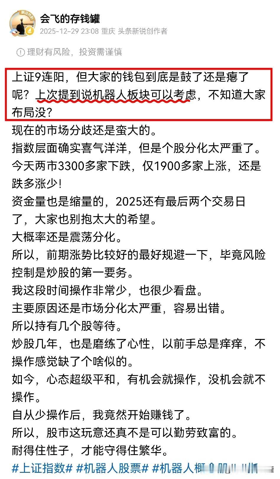 12月26日和29日,我两次提到机器人板块,不知道看过的朋友有没有布局,如果布局了,本月应该是能跑赢大盘。 最近我忽然悟到一个道理: 股票投资不追涨,寻找已经有止跌迹象的热门板块题材股,潜伏等待长阳。 为什么这么做? 因为以前我也追涨,那个题材是热点就追那个,忙的不亦乐乎,但这次赚下次亏钱,感觉完全被资金带节奏了,总体也没赚多少。 自己毕竟是个散户,心理承受能力、技术分析、基本面分析能力都有限。 所以,踩不准节奏,经常接盘主力的事常有发生。 现在,我看股票的时间少了,心态更稳了,操作也没有那么频繁。反而觉得更加得心应手了一些。 今天我收获一个8cm,一个6cm,是本月表现最亮眼的一天。 从指数层面来看,上证指数明日可能会有调整,但大概率也会是微微调,不用太担心。 创业板指数可能会先涨后跌,波动应该会很小,也不用担心。 北证大概率也是微调,元旦后可能有行情。 以上分析都是自己的瞎分析,不准也没什么。 现在的市场仍然是分化的市场,还是那句话,“轻指数重个股”。 最近赚钱了的,可以止盈,不要让自己仓位太重,比如超过8成。 高位股,前段时间疯长的,千万打住不要追。 如果拿的股位置不低,跌了一年,只要没有退市风险的,都可以格局过节。 以上分析,经供参考。