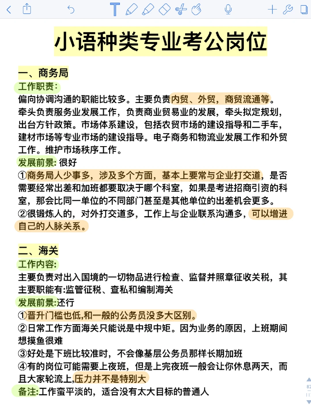 在考公岗位中,小语种岗位的要求相比其他岗位要求会更宽松一些,无论是本科还是硕士都能找到对应的小语种岗位。竞争压力小,通常对基层工作蕞低年限都不做限制。 - 🎯招考部门 1⃣国考:外交部、商务部、对外联络部、文化和旅游部、教育部、海关等等 · 2⃣省考:各省市外事,出入境边防检查站。有接壤的小语种的公务员招收人数比较多。 - 🎯小语种类专业包含 朝鲜语、德语、法语、西班牙语、葡萄牙语、泰语、越南语、日语、俄语、阿拉伯语、波斯语、意大利语、老涡语、缅甸语等专业 - 🎯可以报的岗位 集中在商务局、农业农村局、shui务局、人社局、市场监督管理局、公an局、海关、出入jing等这些部门 - 🎯招考情况 学历主要以本科学历为主,部分岗位会有专业考级要求,报考非通用语职位还需要进行专业科目考试 - 除了报考小语种专业岗位之外,大部分小语种都能报考外国语言文学类岗位,具体能否报考还得看岗位要求