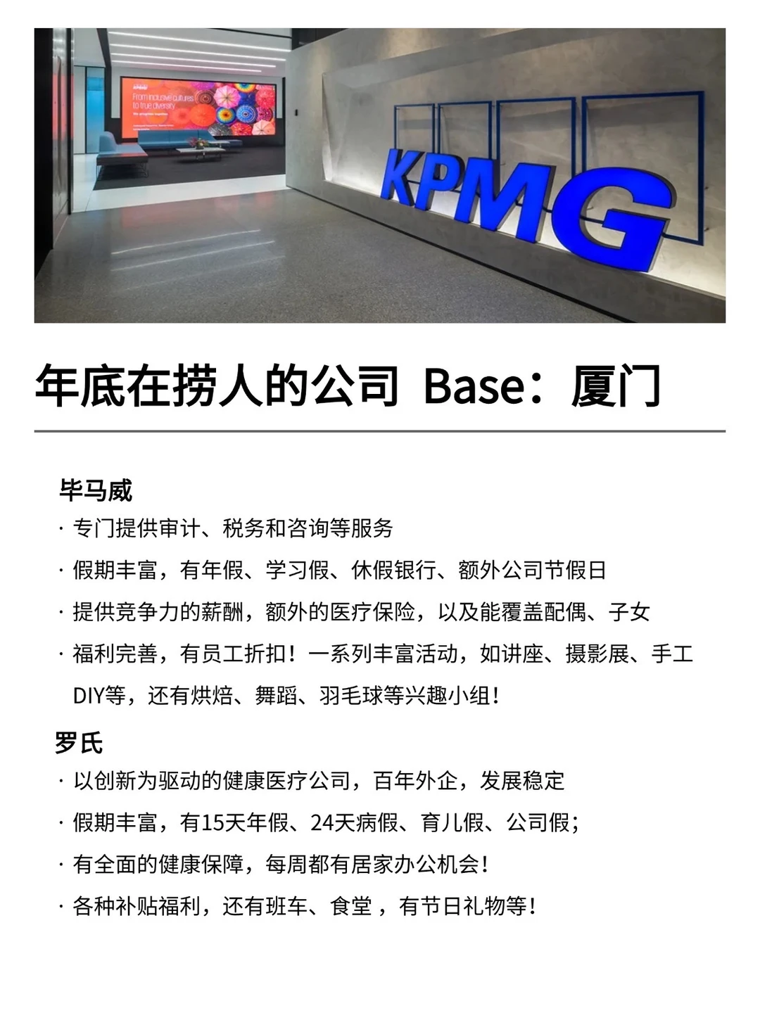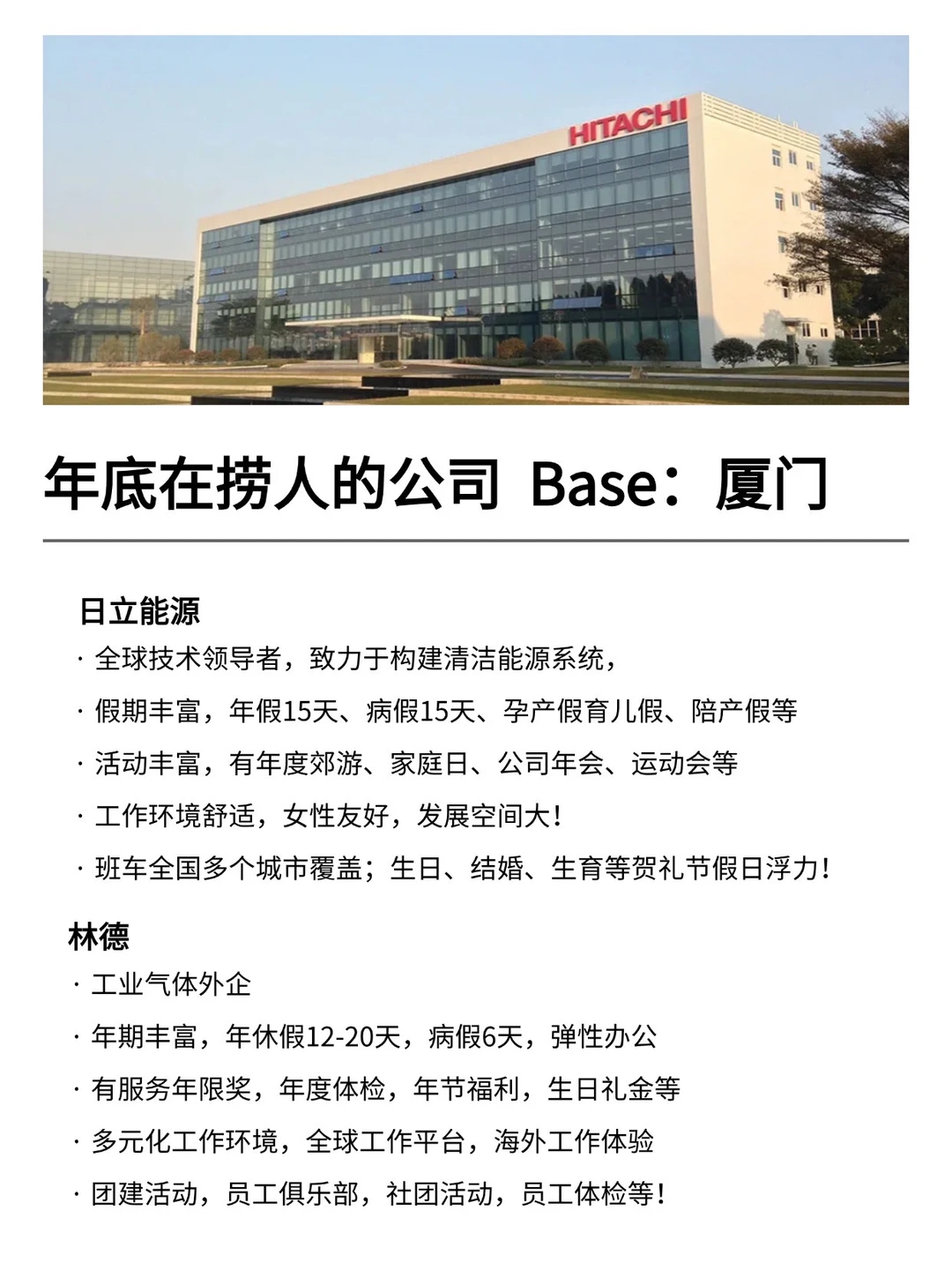 厦门发展真的越来越好,有不少小而美、冷门宝藏的公司,机会是真的很多的! 特别是有不少小众冷门的外企,真心建议大家可以去试试 · 为什么还是值得去外企? ▪️氛围好,对女性友好,年假长,基本上都是10天起步 ▪️很多还都支持居家办公、福利完善,是真的能实现WLB ▪️待遇也还不错,想在年底找工作的真的可以考虑考虑~ · 坚持日更✊🏻,帮大家在找工作路上顺利拿 offer! ·