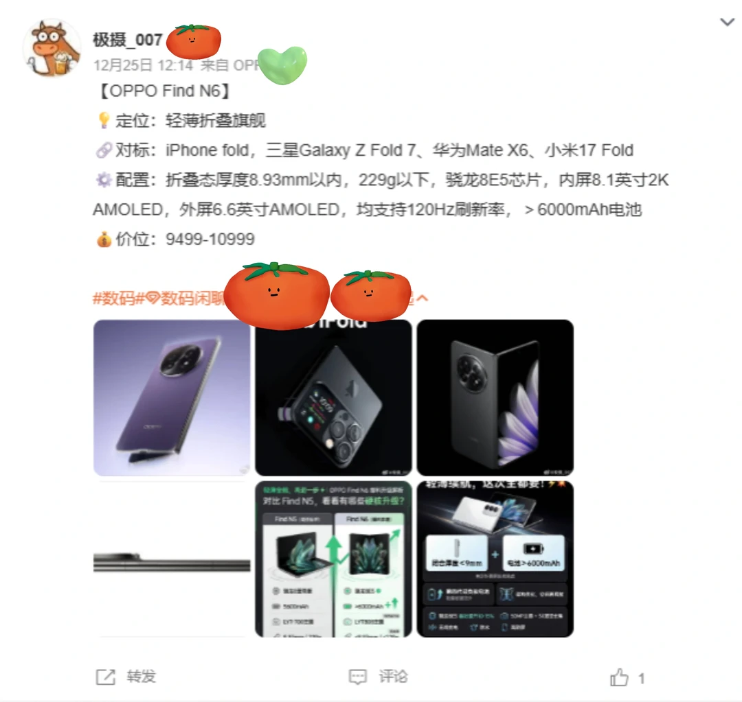 ✅ OPPO Find N6:年初就发!,骁龙8E5+6000mAh大电池,同样冲击无折痕,直接解决性能续航和折痕焦虑。如期落地就是比苹果实打实地早近一年!