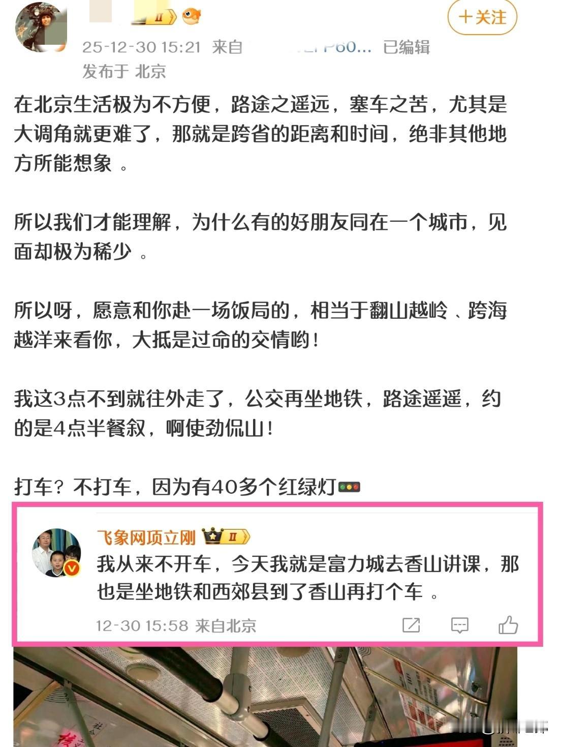 项立刚:“我从来都不开车,都是坐公交、地铁出行!” 这么节俭,难怪这么成功👍老罗真应该好好学习一下项身上的这种“成功因素”🤣🤣 一位网友分享了在北京出行交通的不便,感概生活的不易! 📝项立刚在下方评论→“我从来不开车,今天我就是富力城去香山讲课,那也是坐地铁和西郊县到了香山再打个车。” ———————————————————— 网友原文如下: 在北京生活极为不方便,路途之遥远,塞车之苦,尤其是大调角就更难了,那就是跨省的距离和时间,绝非其他地方所能想象。 所以我们才能理解,为什么有的好朋友同在一个城市,见面却极为稀少。 所以呀,愿意和你赴一场饭局的,相当于翻山越岭、跨海越洋来看你,大抵是过命的交情哟! 我这3点不到就往外走了,公交再坐地铁,路途遥遥,约的是4点半餐叙,啊使劲侃山! 打车?不打车,因为有40多个红绿灯🚥 ———————————————————— 🤔项作为一个企业家,成功人士,还是过着这种从来不开车,坐地铁公交的健康出行生活,真的是很少见。 按常理来说,像项这种身份的人,豪不豪车出行不说,基本也得有一个专用司机,即使没有司机,最起码也是自己驾车出行。 在当下时代,商人出去谈生意,有时候车也在一定程度上彰显着身份,也是方便自己的必要交通工具。 而项呢,也不知道是习惯了节俭朴素的生活,还是怎么的,居然是“从来不开车出行”的方式,真是很难想象得到! (取材:微博)