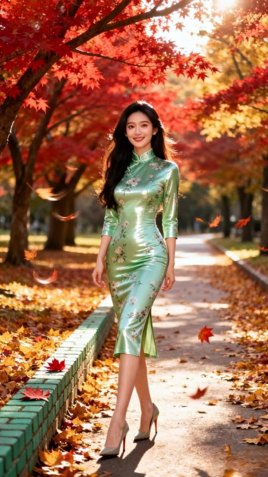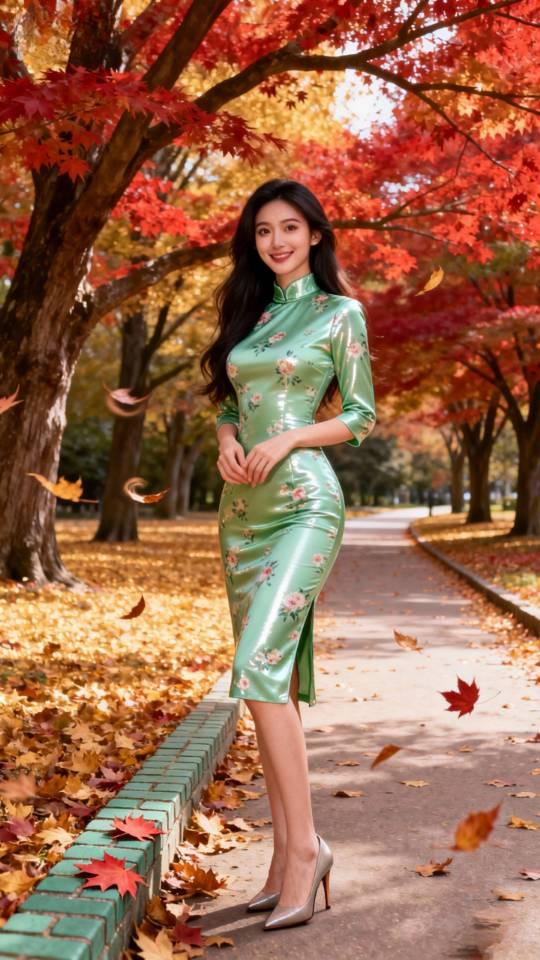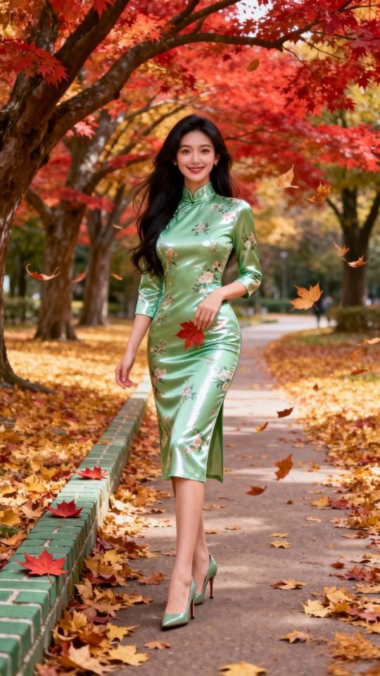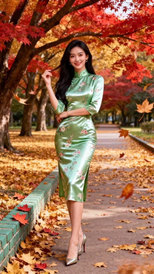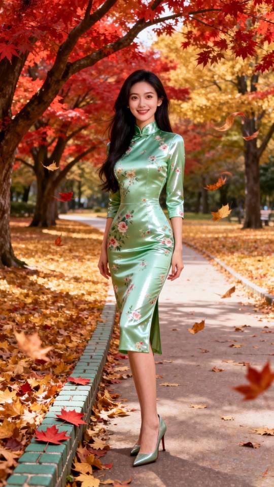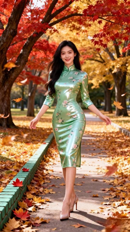 花旗袍裙女子外国公园写真。旗袍旗袍美女
