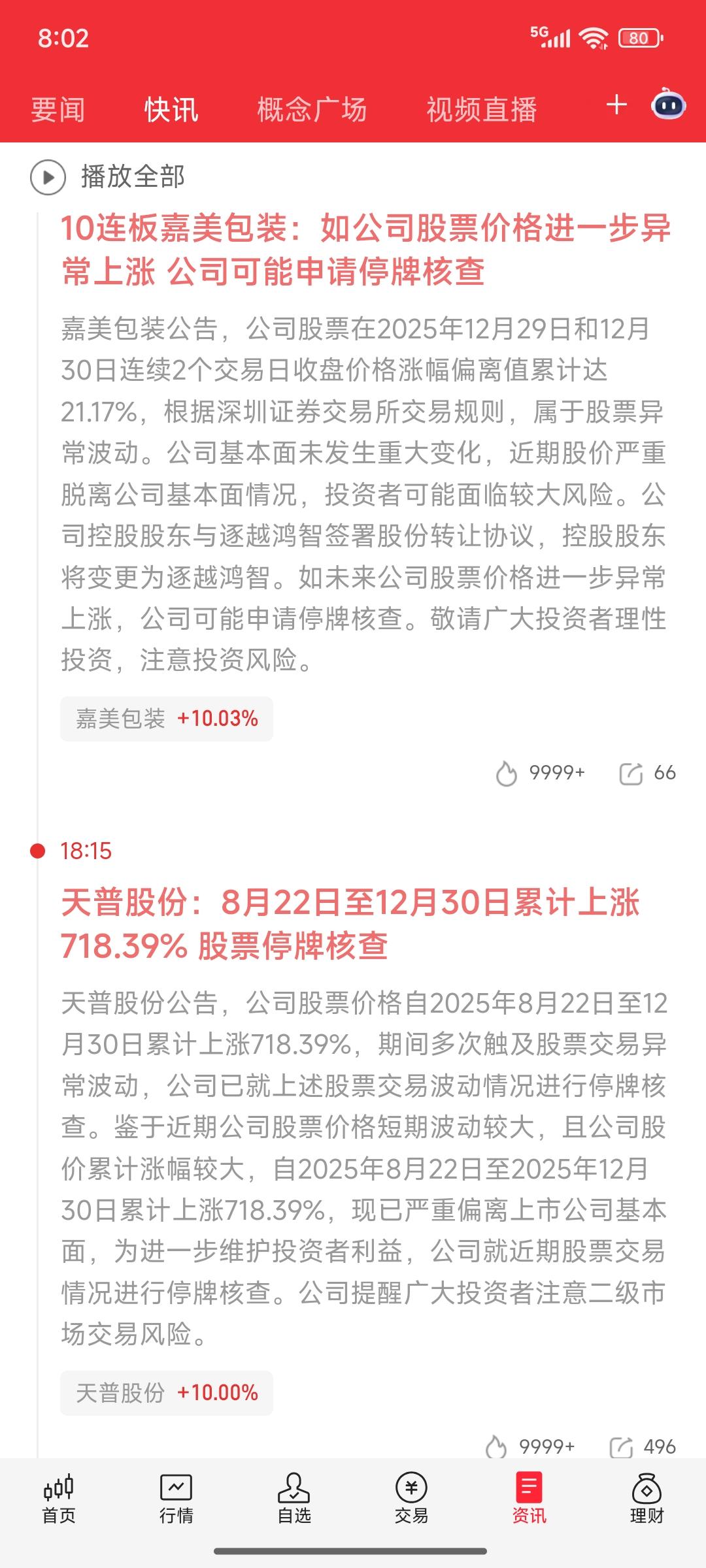 持有天普股份的散户 明天不用看盘了,可以提前过节了 因为股票停牌核查了 比较奇怪的是,这次并没有说停牌多久 现在抱团取暖的现象十分明显 选对股票躺着吃大肉,选不对连口汤都喝不到 旱的旱死涝的涝死,确实应该停牌 让投机情绪冷静一下 另外,嘉美包装也说了,再涨就停牌核查 按照胜通能源的情况,12个板停牌的 大家心里有数就行了
