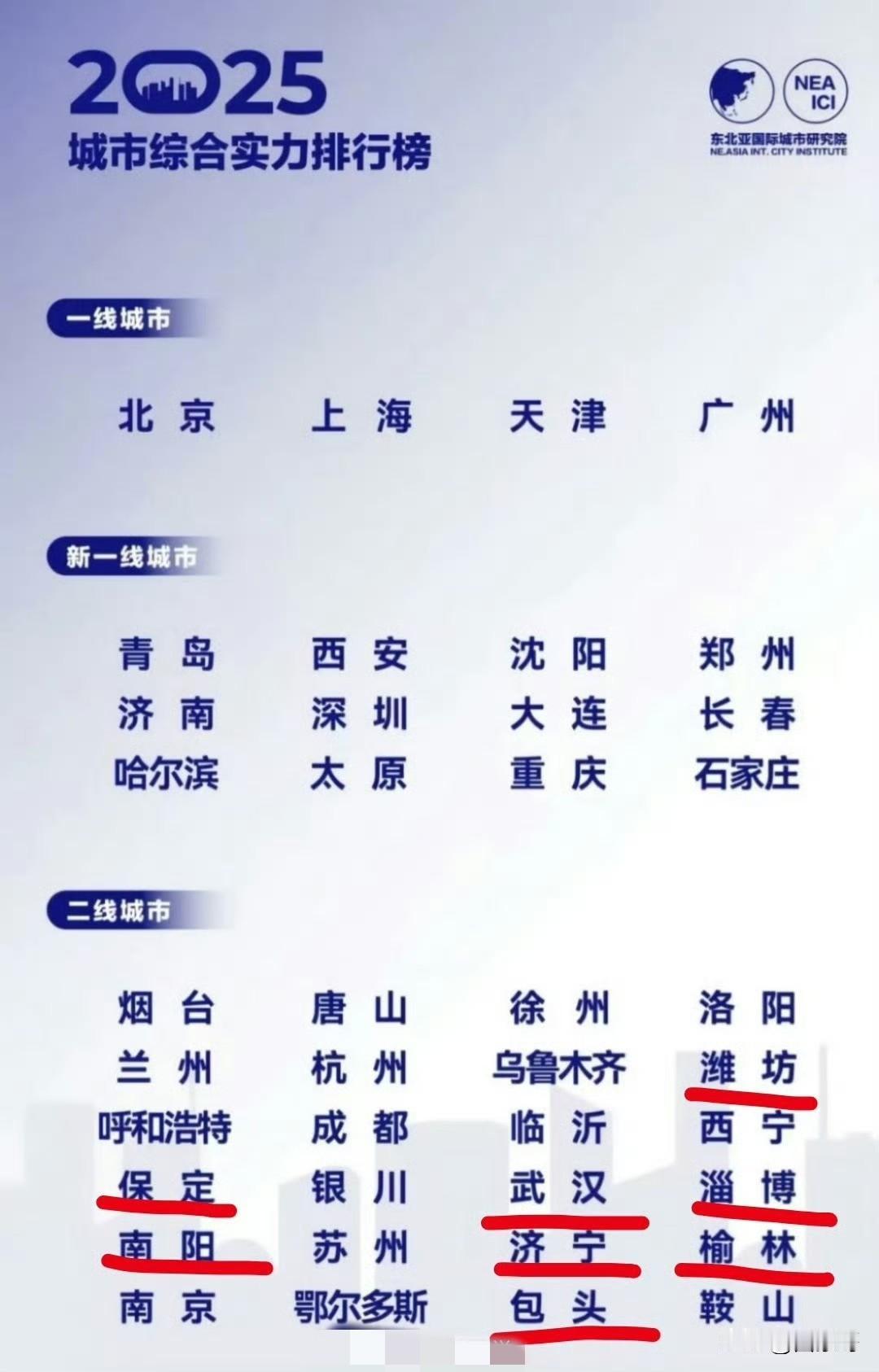 这是东北亚国际城市研究院发布的2025年城市综合实力排行榜,一线城市4个,分别是北京、上海、天津和广州,新一线城市12个,深圳及东北三个省会城市位列其中,二线城市24个,包括鄂尔多斯、榆林、包头和兰州等西部城市,跟成都、武汉和杭州等城市并列。 大家觉得这个榜单排名如何?欢迎在评论区留言讨论