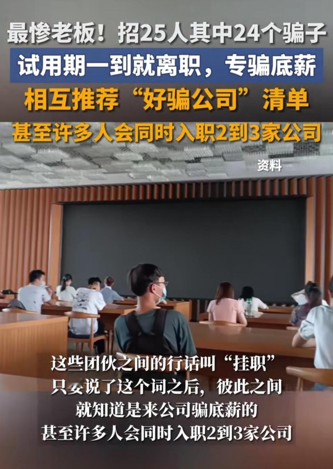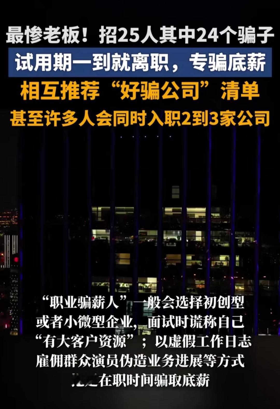 刷到北京老板招聘被骗的新闻,我直接看愣了:招25个员工,竟然24个是来“骗底薪”的,试用期一到就跑路,连社保都省得让公司缴。 这老板得多崩溃啊?招人、培训、搭团队,费心费力忙活半天,结果全是来薅羊毛的。这些骗子摸透了试用期规则,专挑小企业下手,拿着底薪不干活,转头换家公司继续骗。 其实不止老板难,现在找工作也卷得厉害,可再难也不能走歪路啊!这种骗薪操作,不仅坑了真心招人的企业,还会让老板们对求职者更谨慎,最后受伤的还是普通打工人。 职场里的信任本来就脆弱,靠骗来的底薪发不了财,反而坏了自己的口碑。不管是招人还是找工作,真诚才是最靠谱的底气。