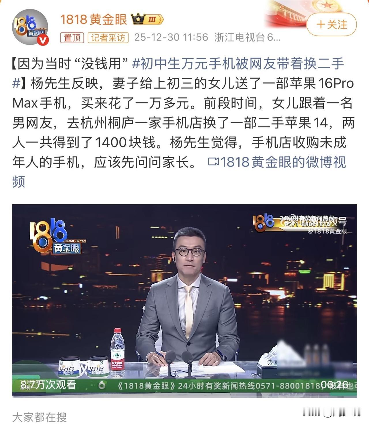 太气人!浙江一初三女生拿着母亲送的万元苹果16Pro Max新机,竟跟着陌生男网友,私自到手机店换成二手苹果14,两人只换得1400元,理由仅仅是“没钱用”。家长得知后又气又急,直言手机店收购未成年人的贵重物品,理应先核实家长意见,不该如此轻率。 此事一出,网友炸开了锅。有网友怒斥:这哪里是换手机,分明是被坑骗,孩子太单纯,轻易就被外人拿捏! 也有网友感慨:初中生拿着万元机本就不妥,金钱观和防骗意识都没建立好,迟早要吃亏。 看完这件事,周少不得不说给所有家长上了一堂深刻的教育课。青春期孩子心智未熟,对金钱没概念、对陌生人无防备,再加上虚荣心和跟风心理,很容易被外界诱惑拿捏。 家长给孩子贵重物品的同时,更要做好金钱观和安全教育,教会孩子辨是非、懂取舍,守住自己的财物与本心。 一味满足物质需求,却疏于思想引导,终究会让孩子栽下成长的跟头,这也是家庭教育里最不该缺席的一课! 当然,这事情也不得不指责该手机店老板,为了赚取利润,擅自收取学生的手机,也怨不得该学生家长痛斥,真的气人!#寻美三湘# #长沙新朋友#