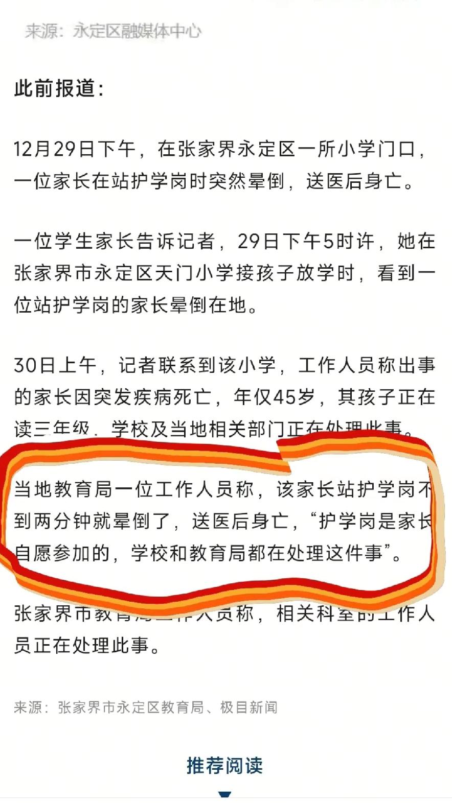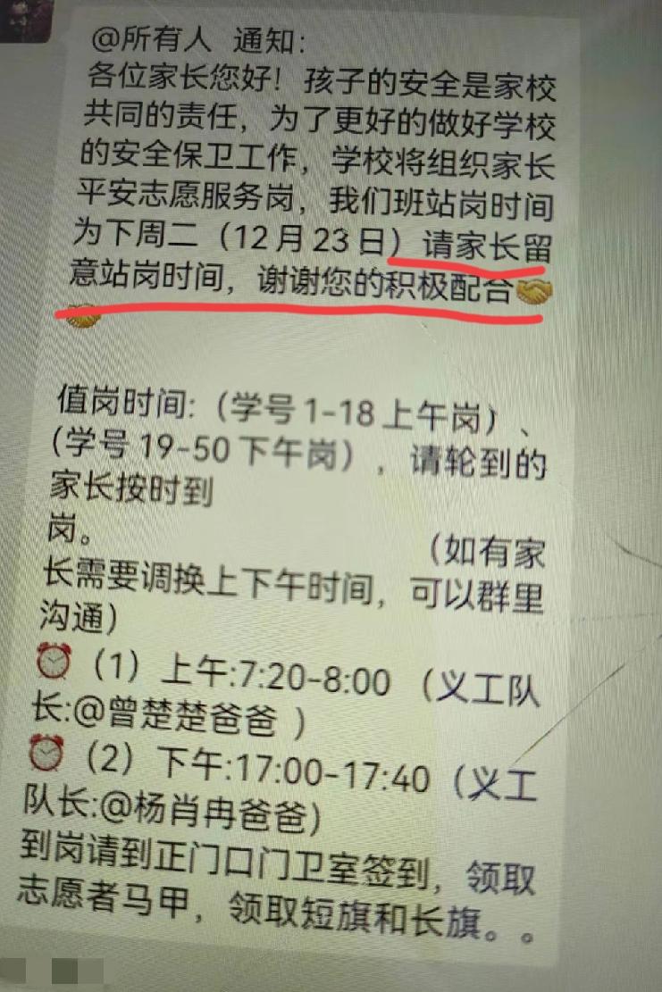护学岗这个事儿,本来作为家长,不去是有难言之隐的,不去吧又说你不配合。但现在闹大了,谁也不会想到护学岗会闹出人命! 湖南张家界,在一所小学学校,一名45岁的男家长,在护学岗时突然晕倒,抢救无效离世! 护学岗,不少学校都提出过这个需求,尤其是刚开学时候,班级群开始发送护学岗的通知,看似客气,说没有强制要求。但作为家长,心里都很清楚,这种事儿,谁敢提出不配合? 现在的家长,本来都上班,还得给孩子准备饭菜,尤其是早上,开车接送,护学岗还得提前到校至少40分钟… 现在谁不忙?但为了孩子,硬着头皮配合,不管家里有多乱,饭吃没吃,马上穿上那个荧光绿的工作马甲,拿着指挥棒,在校门口来回穿梭,护送每一孩子安全进校门… 但谁能想到,张家界一名家长,就是在这样的情况下而离世的,这个是不是应该值得每所学校去思考,护学岗到底有没有必要?提了哪个家长敢说不配合? 特别讽刺的是,张家界教育局的通告,说这名家长刚到岗不到两分钟就晕倒了,护学岗都是家长自愿的! 这通告的内容,大家听出来了吗?这不是在甩锅吗?!什么叫自愿,为了孩子敢不去吗?不提不就没有这个事儿了吗!大家觉得这个责任应该是谁来负? 家长护学执勤岗 护岗家长
