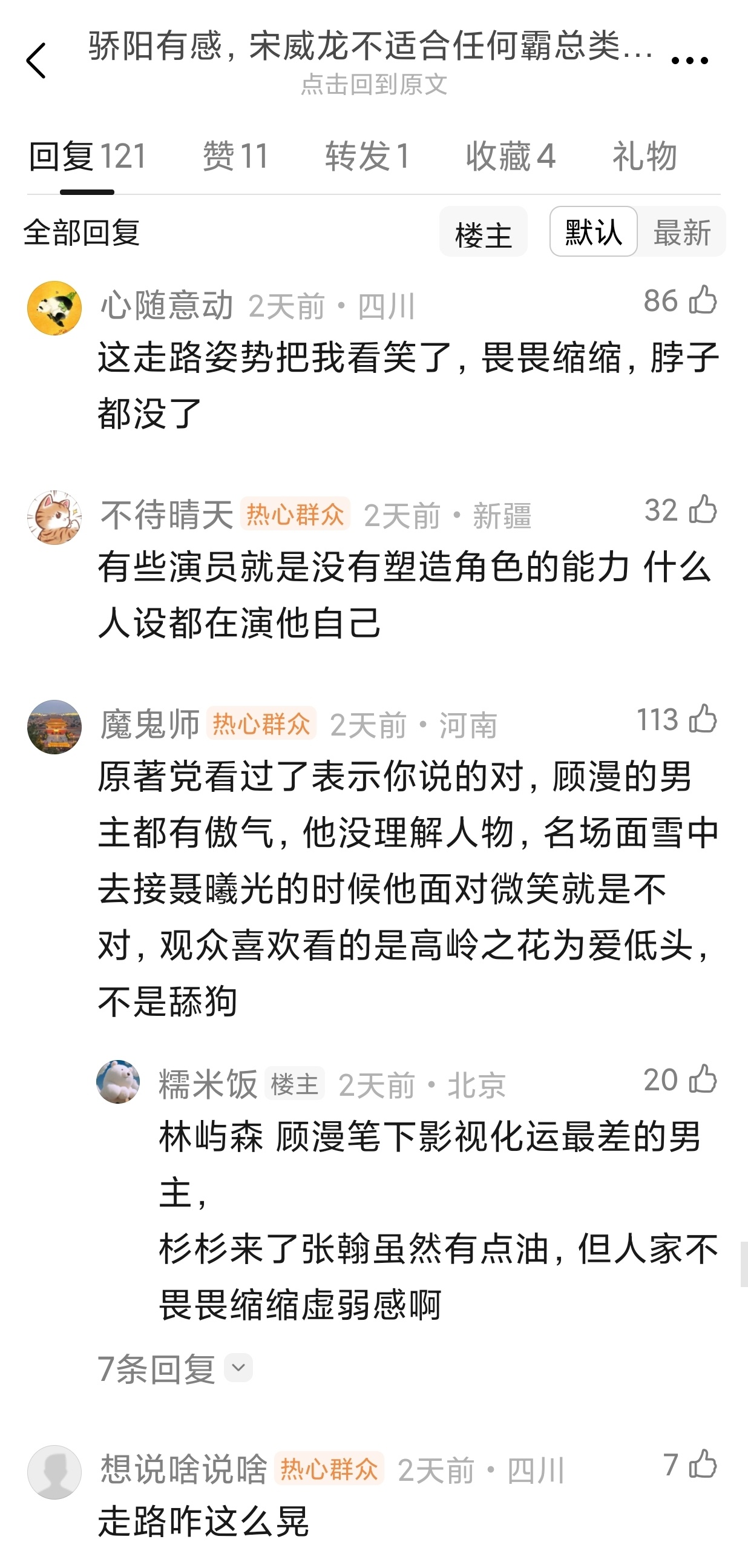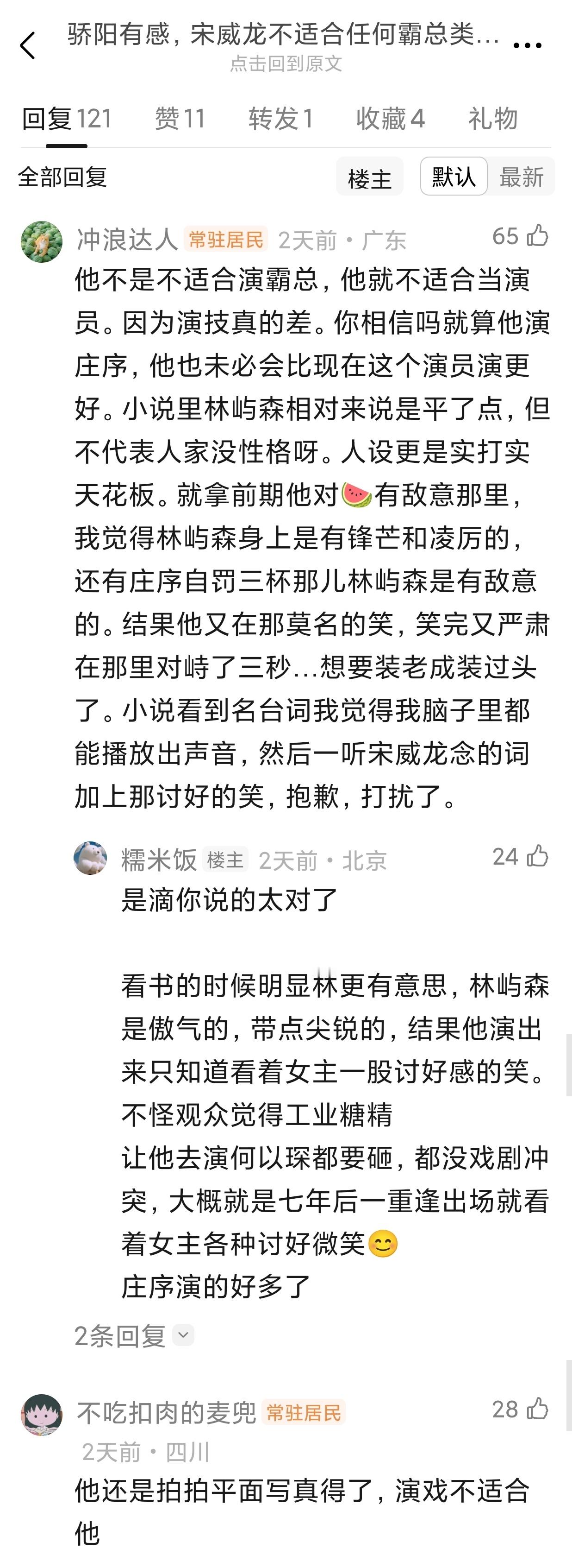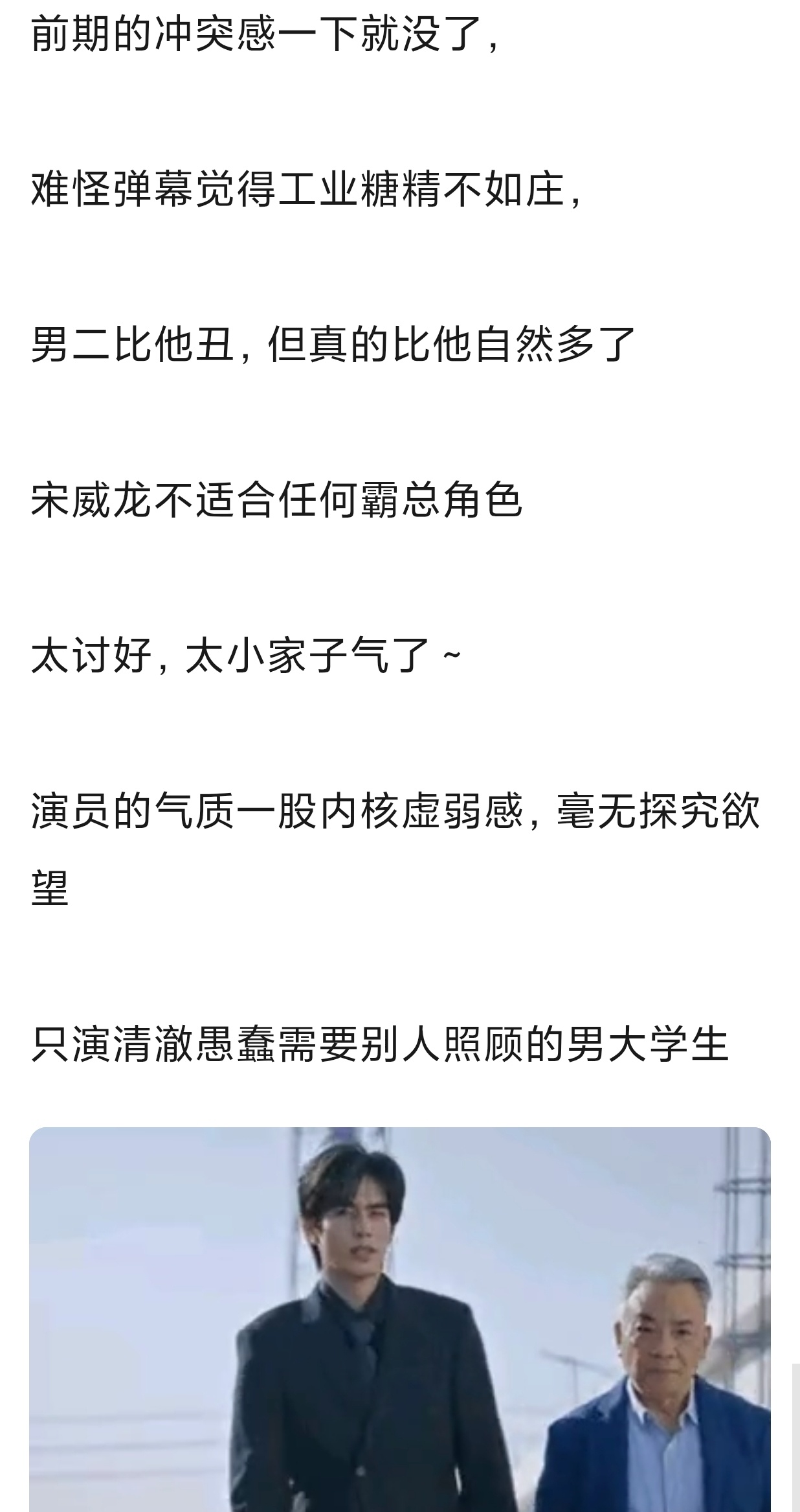 tg.瓣组上百层的高楼热议,网友看了《骄阳似我》有感,宋威龙是不是压根不适合演现偶霸总?网友说宋威龙的演法对女主充满刻意的讨好感,而且仪态太局促小家子气,没有霸总气场。看起来不太聪明的样子,反而更像男大生(所以《下一站幸福》里的元宋🐉演起来就自如很多)。 导致原著里人气断层的林屿森居然被凤凰男庄序掀 桌,被网友赐名“IP粉 碎 机”了你们觉得有道理吗宋威龙张婧仪牵手舞台于正否认雪藏宋威龙