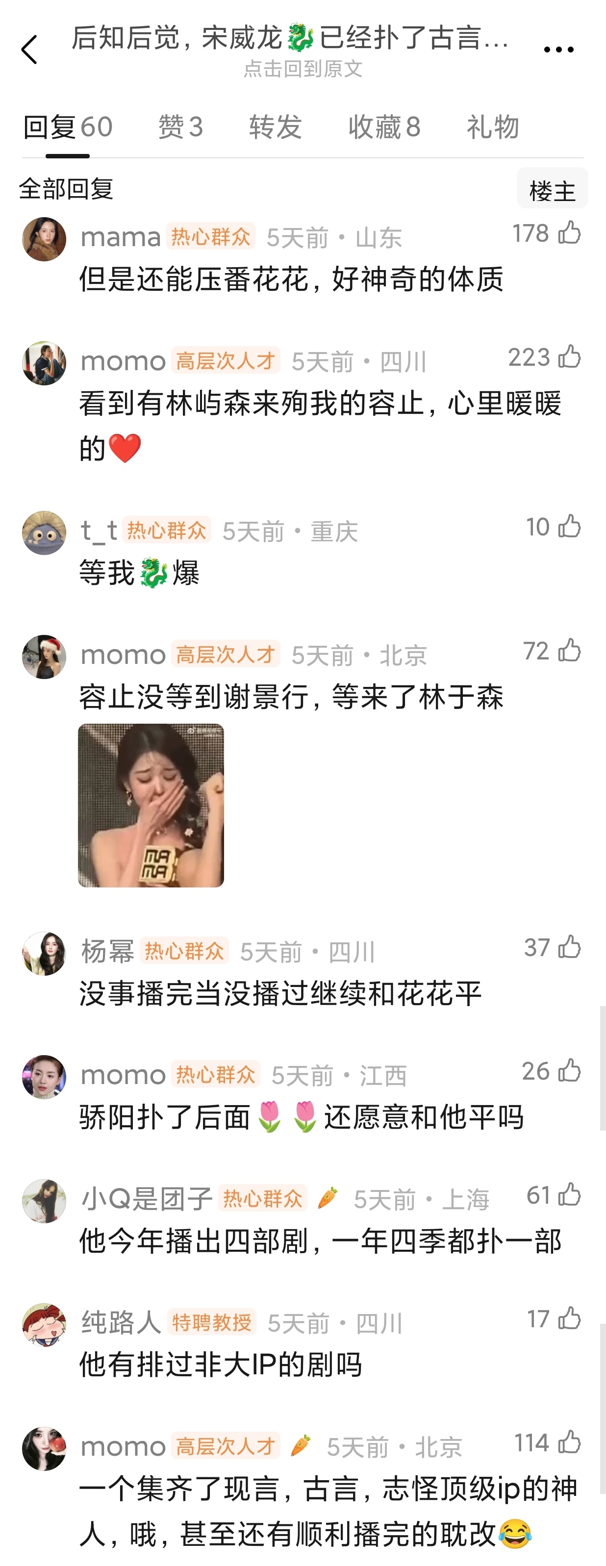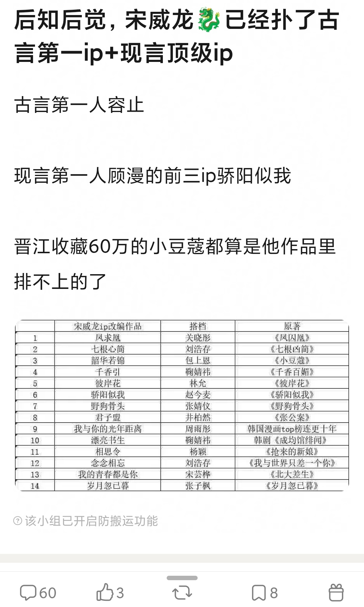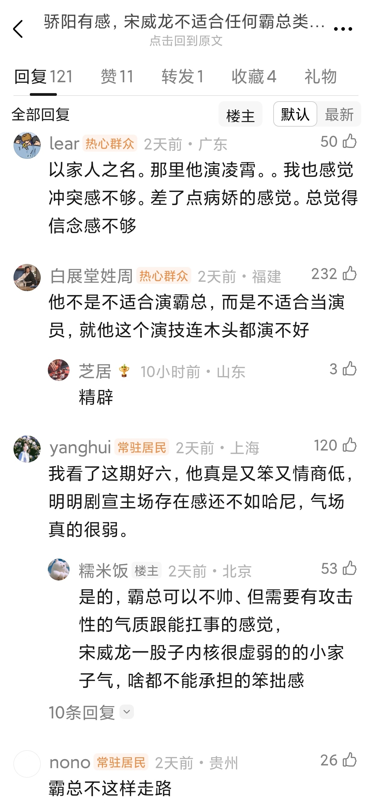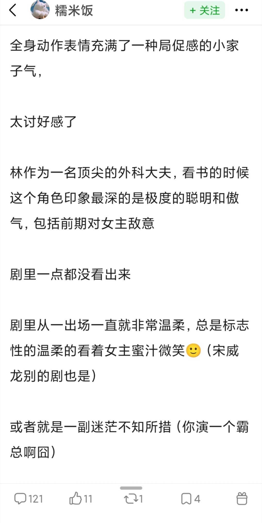 tg.瓣组上百层的高楼热议,网友看了《骄阳似我》有感,宋威龙是不是压根不适合演现偶霸总?网友说宋威龙的演法对女主充满刻意的讨好感,而且仪态太局促小家子气,没有霸总气场。看起来不太聪明的样子,反而更像男大生(所以《下一站幸福》里的元宋🐉演起来就自如很多)。 导致原著里人气断层的林屿森居然被凤凰男庄序掀 桌,被网友赐名“IP粉 碎 机”了你们觉得有道理吗宋威龙张婧仪牵手舞台于正否认雪藏宋威龙