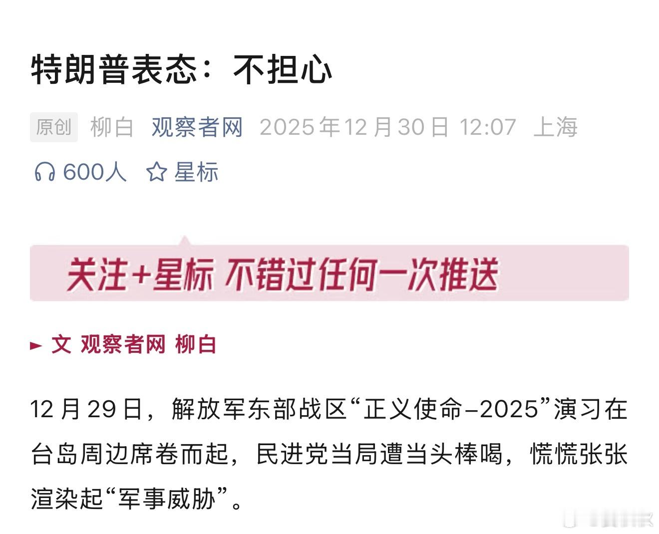 特朗普说“不担心”解放军军演,在台岛周边席卷而起。特朗普怎么回应呢?“不担心”!根据“观察者网”,特朗普明显淡化了军演。他表示,自己并不担心台海周边局势,毕竟中方20年来一直在该地区开展演习。特朗普的这番表态,是对台独的狠狠打脸。毕竟就在本次军演11天前,美国政府宣布,将向台湾地区出售价值超过111亿美元的武器装备,这一金额创下美国对台军售的历史之最,并引发中方强烈不满。台独为什么要买美国武器,不就是想营造“被美国保护”的假象吗?而且这次军演,美国的对台军售,也是诱因之一。如今,特朗普轻飘飘一句“不担心”,让台独们情何以堪?尤其是此番军演,解放军无人机俯瞰台北101大厦。解放军还发布了视频,展示自动化人形机器人、微型无人机和武装机器狗实施攻击的画面。所以呢,要么不打,要打就是排山倒海,迅雷不及掩耳。应该看到,台湾必归。区别只在于,何时回归,以及是否和平回归。特朗普“不担心”,我们当然更“不担心”,那么,谁该担心呢?外交部让日媒记者关注东部战区消息外交部回应东部战区演习特朗普说“不担心”晏秋秋