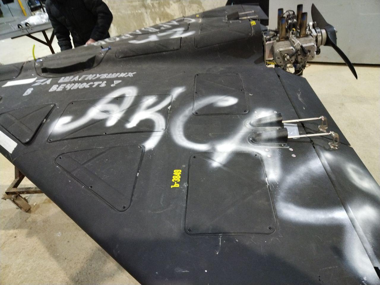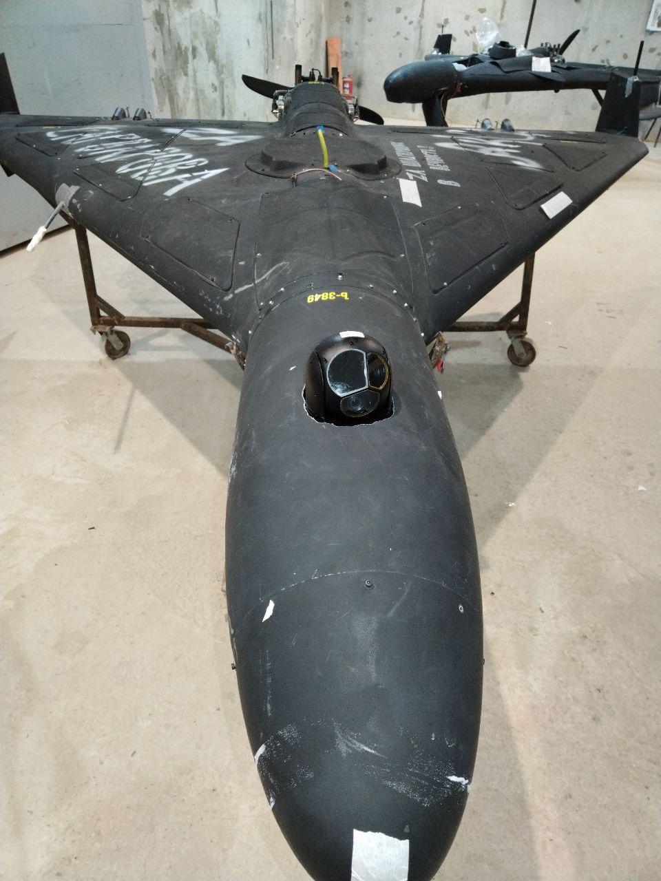 俄罗斯“Geran-2”无人机(伊朗Shahed-136无人机的变体)的特写照片,照片显示该无人机配备了新型椭圆形控制接收模式天线(CRPA),用于GPS抗干扰,并装有车载摄像头,机身上标有工厂编号b3849,以及亲乌克兰的涂鸦,例如“За ВСУ”(献给乌克兰武装部队)。 这凸显了俄罗斯在乌克兰冲突期间对无人机进行的最新升级,其中CRPA技术旨在对抗西方的电子战;乌克兰情报部门2025年9月的报告详细介绍了Geran-3型号无人机的类似改进,以提高导航系统的抗干扰能力。