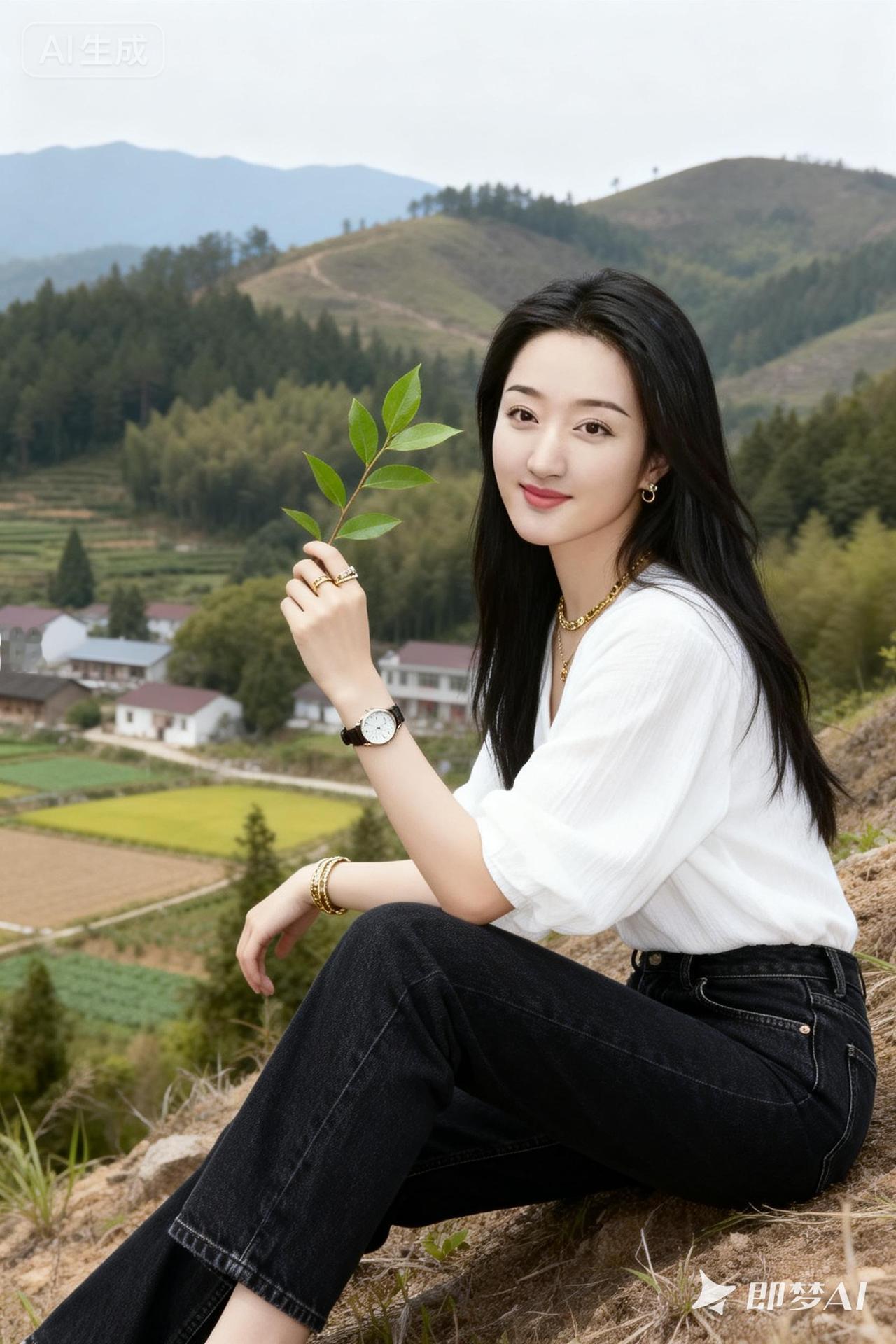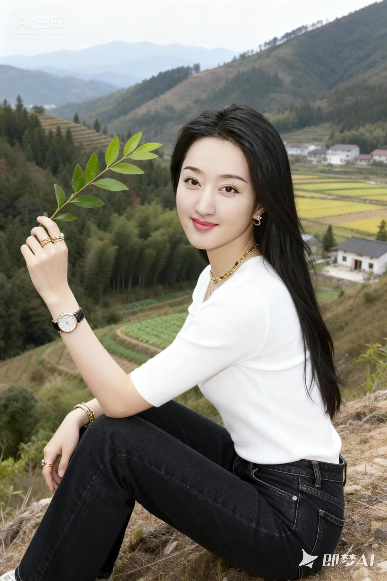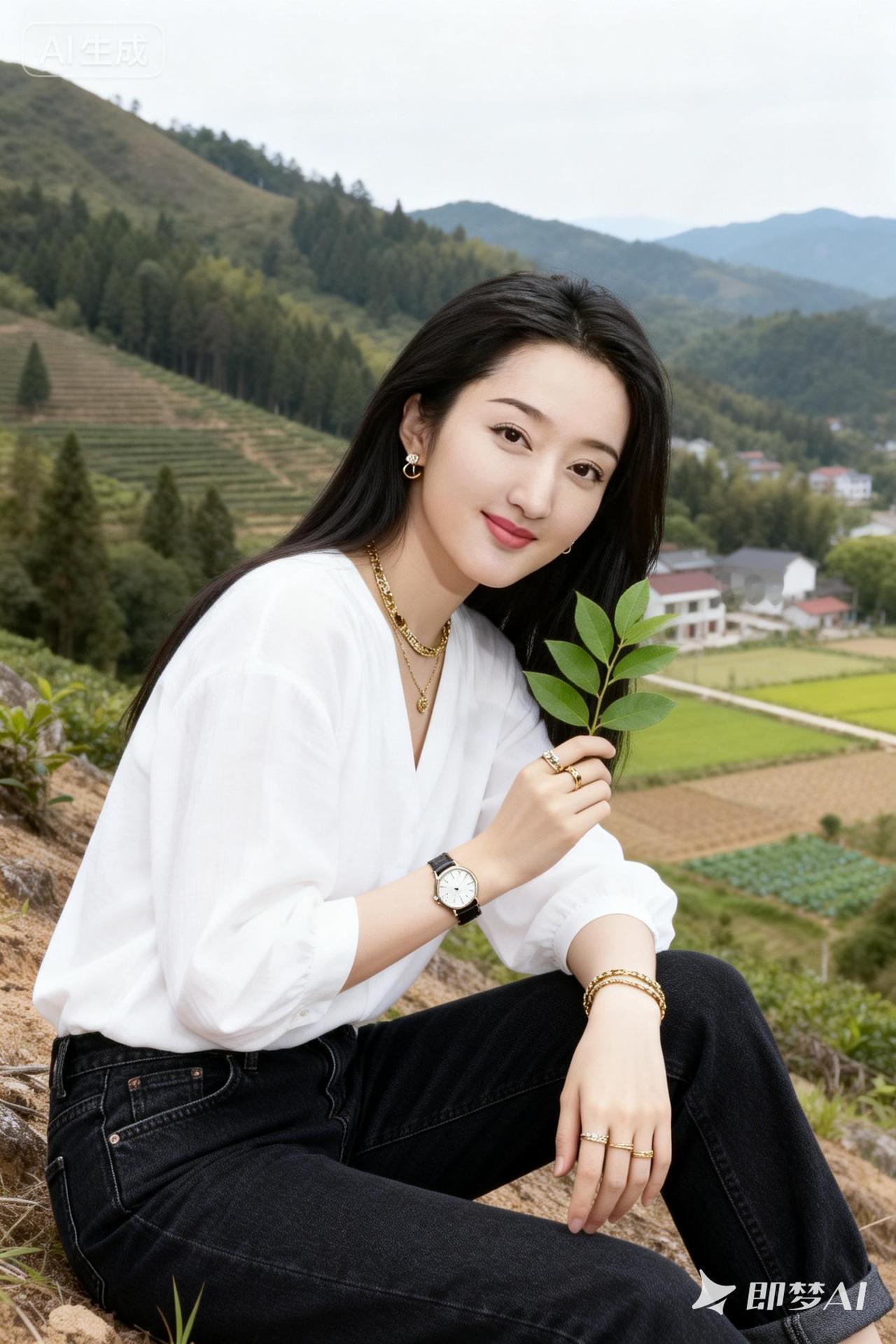 在山间小路上,她轻轻举起一片绿叶,微笑着看向镜头,仿佛在述说着大自然的美好。