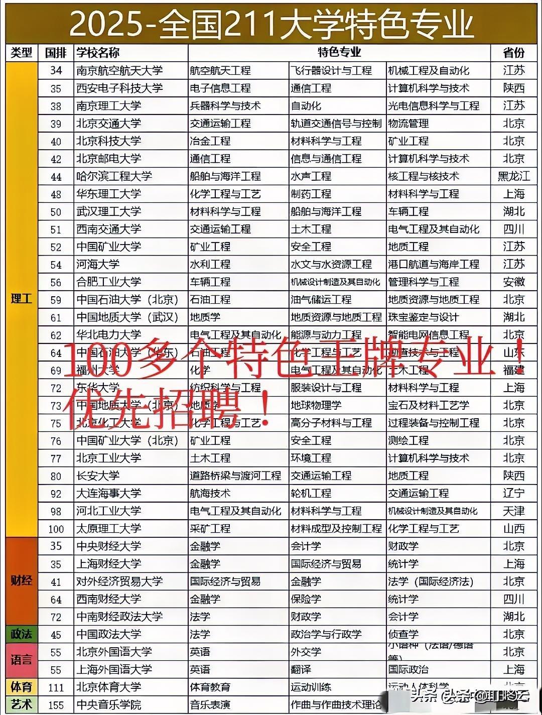 就业王牌!全国211大学100个特色王牌专业汇总揭秘!选对专业,就业有保障,优先获得招聘机会!比如说,1.西安电子科技大学:电子信息工程、通信工程、计算机科学与技术; 2.北京科技大学:冶金工程、材料工程、矿业科学与工程等等; 3.武汉理工大学:材料科学与工程、车辆工程、船舶与海洋工程;欢迎评论区留言补充,并交流讨论。[点亮平安灯][点亮平安灯][烟花][烟花] 本文汇总60所大学100多个特色王牌专业,在经济不景气形势下,面临就业寒冬,这些专业毕业生就像冬日暖阳,就业择业有特殊优势!速速围观揭秘详细内容![点亮平安灯][点亮平安灯][烟花][烟花] 欢迎关注@叮咚云 将优先为粉丝职业规划指导,1对1咨询是付费服务,为你定制最适合的就业择业方案!欢迎留言交流讨论。[来看我][来看我] 免责声明:图片来自网络,仅供参考!