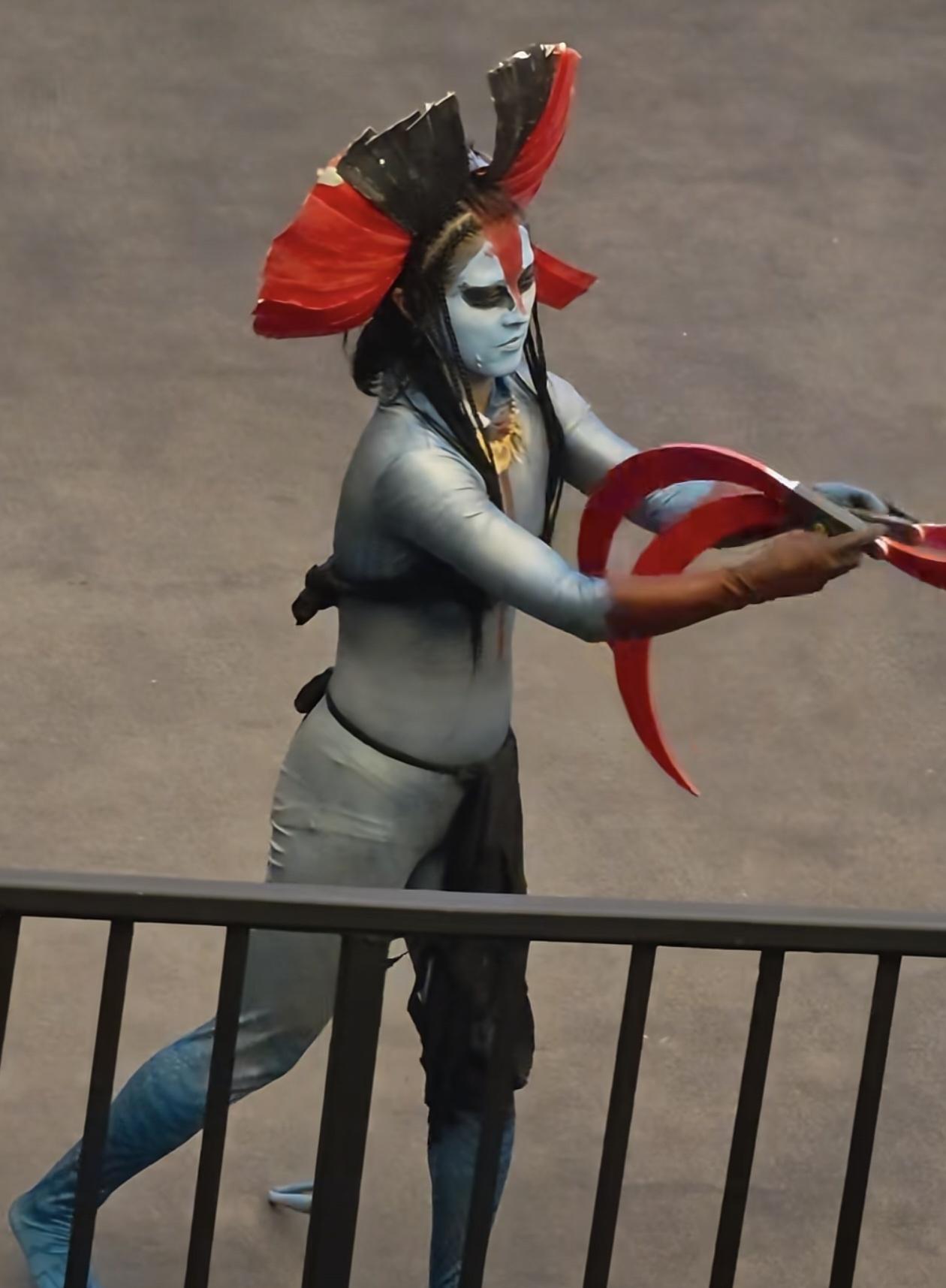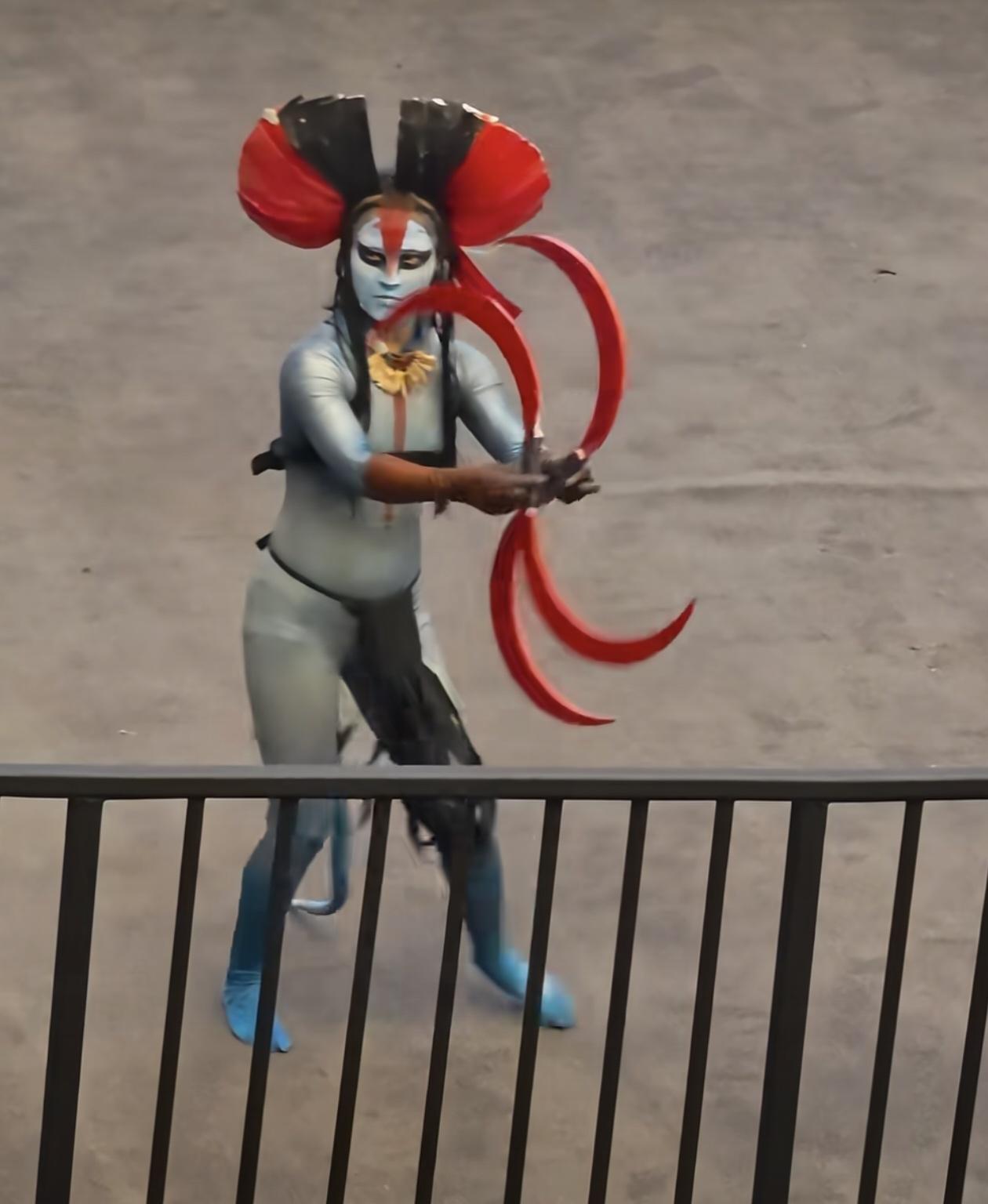 谁能想到《阿凡达3》的彩蛋不在银幕里,而在影院现场啊! 电影播完滚动字幕时,全场观众正盯着屏幕找彩蛋,一扭头直接看傻了——台下居然站着位扮成纳美族的表演者,手里甩着红色环环耍杂耍,动作行云流水,蓝皮肤、头饰跟电影里的角色适配度拉满,瞬间有种“潘多拉星人闯到现实影院”的错觉。 一开始还以为是影院请来的氛围演员,后来才发现这居然是官方埋的隐藏彩蛋!只能说卡梅隆玩彩蛋的路子也太野了,别人藏画面里,他直接把“潘多拉来客”空投到观众眼皮子底下,这波沉浸式彩蛋我愿称年度最惊喜! 有没有同款在影院偶遇这位杂耍纳美人的朋友?评论区说说你们当时的反应啊,哈哈哈哈~