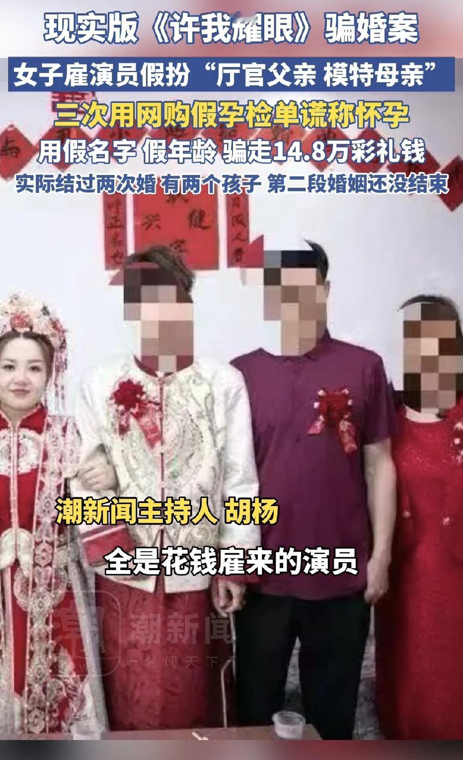 一网红主播网恋遇上“白富美”,本以为遇到了真爱,爽快给了14.8万彩礼,可没想到结婚后却发现,岳父母是花钱雇的,怀孕是假的,就连女友名字和年龄都是编的,更让人意想不到的是,女子竟然结过两次婚、有两个孩子,第二段婚姻还没有结束! 2022年,网红主播郑浩东被一个叫“尹小迪”的女孩主动搭讪。女孩说自己是1994年出生的。 由于“尹小迪”长得清秀,嘴还甜,两人没聊多久就确立了恋爱关系。 没过多久,“尹小迪”说要带母亲见他。见面时,这位“母亲”打扮得十分得体,但张口就提了见面礼,郑浩东并没有多想,而是用心准备了10001元的红包,寓意“万里挑一”。 可郑浩东仔细观察时,还是发现了不对劲的地方,只见“母亲”说话总是吞吞吐吐,而且还总是偷偷看“尹小迪”,很明显是要照着旁边“女儿”的提示回话。可即便这样,早已被爱情冲昏头脑的郑浩东,还是老老实实把钱给了。 可没想到,这之后,“尹小迪”却接连搞出大动作。她先是三次发孕检单给郑浩东,说自己怀孕了,催着赶紧结婚。 为了让婚事顺利进行,她还特意雇了个职业演员,假扮自己的“厅官父亲”,又找了个情感主播当“哥哥”,专门斡旋婚事细节。 在“尹小迪”精心筹划的骗局下,郑浩东一家人彻底放下了戒心,按照要求准备了14.8万现金彩礼,婚礼办得热热闹闹。 此外,“尹小迪”还带来了46万的嫁妆存单和一根金条,说是父母给的陪嫁。 可意外发生了,婚后没几天,郑浩东无意中刮了一下金条,没想到表层竟然直接掉色了!他赶紧去银行查存单,结果银行说根本没有这笔存款记录。 骗局瞬间穿帮,郑浩东立刻报警。警方一查,真相让他彻底崩溃。原来,这个“尹小迪”真名尹立肖,实际是1989年出生,比说的大了5岁。 更离谱的是,她结过两次婚,有两个孩子,第二段婚姻压根没结束,属于重婚。所谓的“厅官父亲”“模特母亲”,全是她花钱雇来的演员,三次孕检单也都是从网上买的假货。 最终,尹立肖因诈骗罪一审获刑4年6个月,扮演“哥哥”的情感主播因为深度参与骗局,目前另案处理。 有网友说:这简直是现实版《许我耀眼》啊!雇演员演父母也太拼了,郑浩东真是被爱情蒙蔽了双眼,连对方母亲说话照念都没起疑。 也有网友说:14.8万彩礼不是小数目,结婚前连对方真实身份都不核实吗?现在“租人扮角”的服务到处都是,骗子的套路越来越专业了。 还有网友说:最可怕的是三次假孕检单,还有没离婚就再婚,这女的心思全用在骗人上了。演员虽然没被追责,但这种不明用途的演出真该管管。 说到底,这场骗局之所以能成功,本质是“精准拿捏”了两点: 一是郑浩东对婚恋的迫切需求,二是对“优越家境”的盲目信任。尹立肖打造的“年轻貌美+高官父母+怀孕逼婚”套餐,正好戳中了不少人对理想婚姻的想象。 但更值得警惕的是背后的“租人演出”乱象。现在社交平台上,雇人扮演亲属、同事、领导的服务随处可见,接单不用审核,流程简单,很容易被骗子利用。 就像这起案件里,演员只拿钱办事,不管雇主用途,无形中帮骗子完成了骗局。 其实避免这类骗局并不难:婚恋时一定要核实对方真实身份,户口本、身份证亲自查验;大额彩礼尽量走银行转账,留下凭证;遇到对方频繁提钱、家境过于完美的情况,多留个心眼,找亲友帮忙参谋。 爱情可以浪漫,但不能盲目。别让高额彩礼变成骗子的“提款机”,也别让对美好生活的向往,变成被欺骗的软肋。 对于此事,你怎么看呢? (来源:潮新闻)