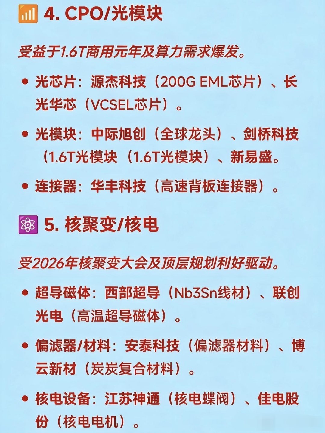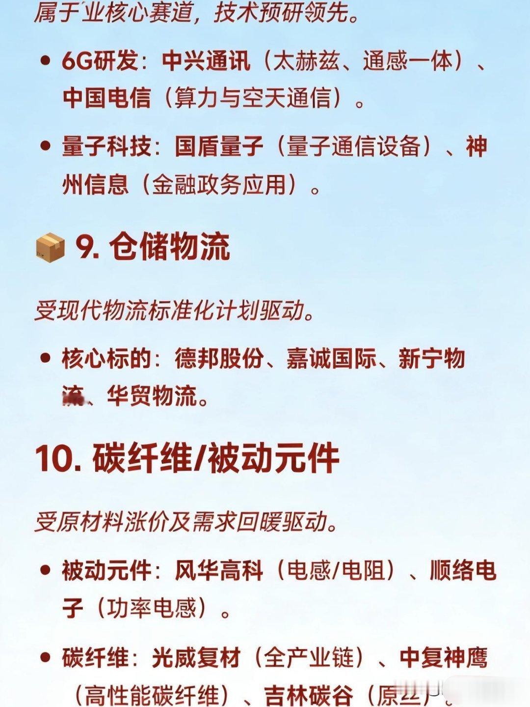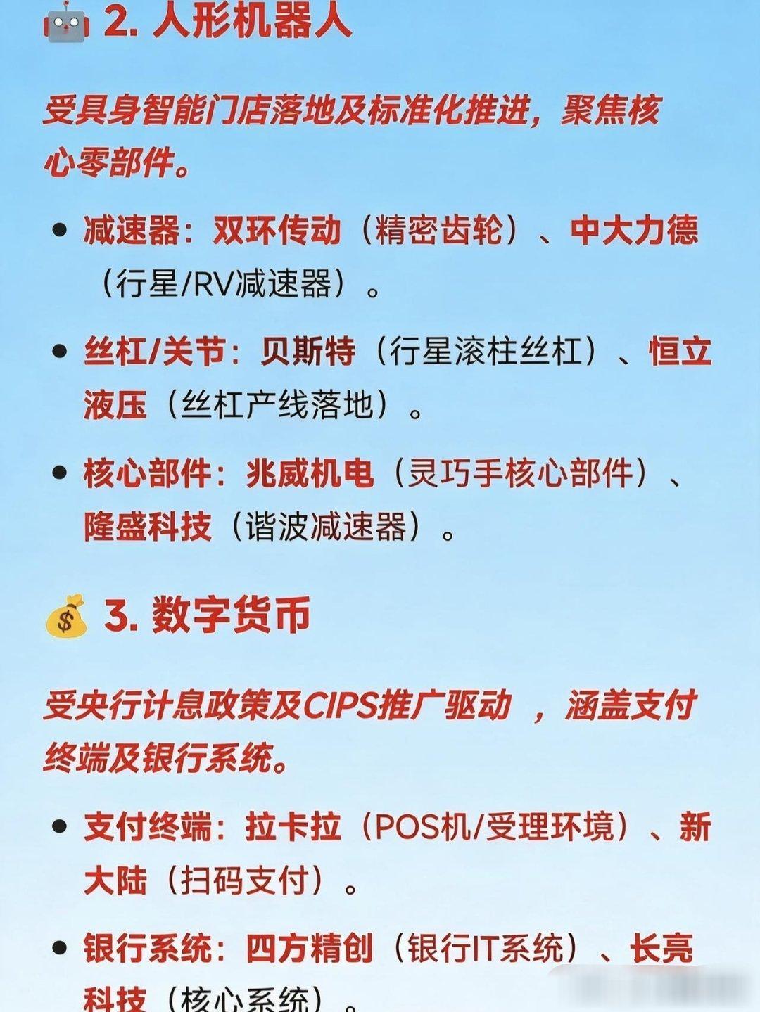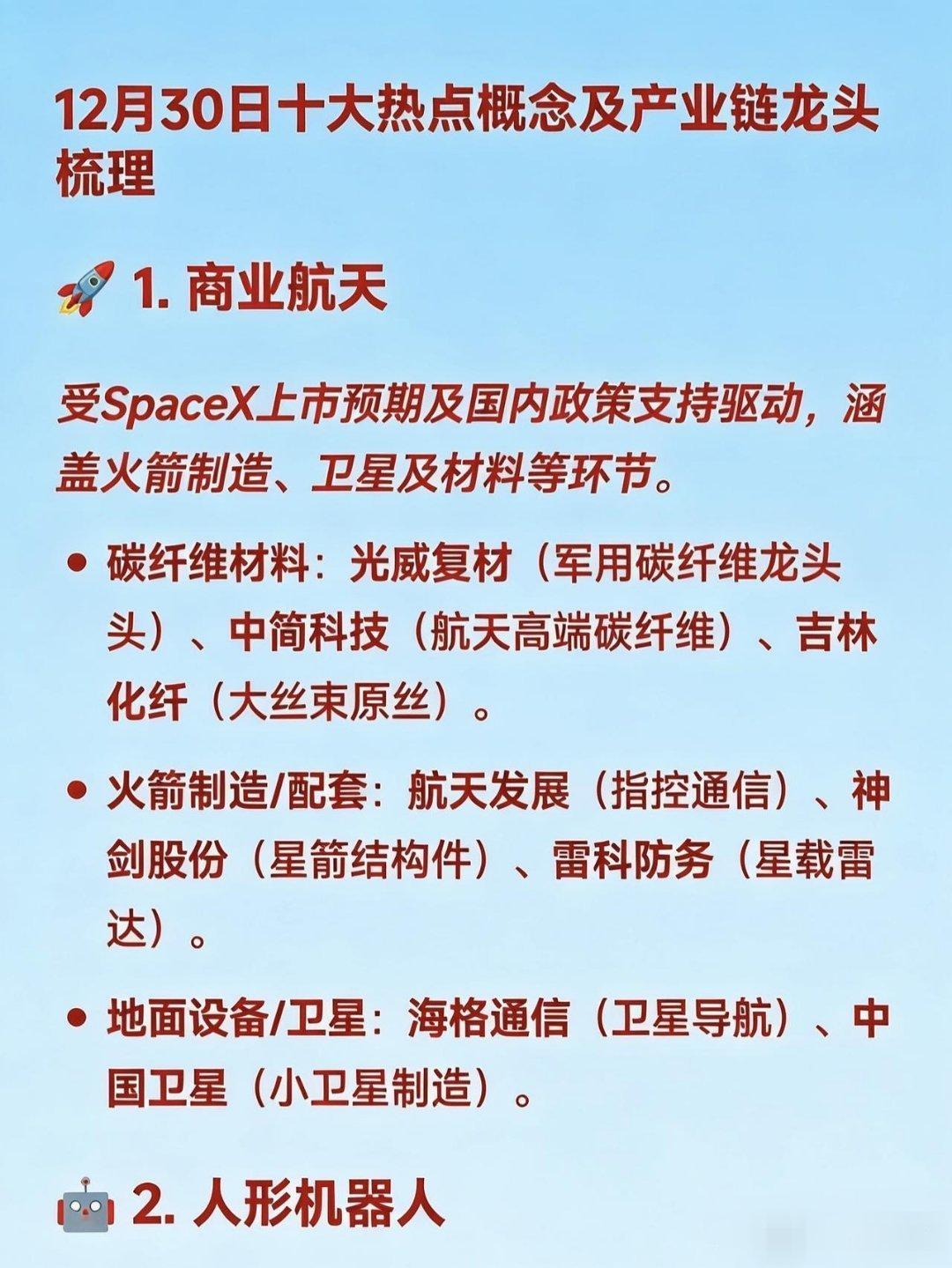 12月30日十大热点概念及产业链龙头梳理🚀1.商业航天受SpaceX上市预期及国内政策支持驱动,涵盖火箭制造、卫星及材料等环节。碳纤维材料:光威复材(军用碳纤维龙头)、中简科技(航天高端碳纤维)、吉林化纤(大丝束原丝)。火箭制造/配套:航天发展(指控通信)、神剑股份(星箭结构件)、雷科防务(星载雷达)。地面设备/卫星:海格通信(卫星导航)、中国卫星(小卫星制造)。🤖2.人形机器人受具身智能门店落地及标准化推进,聚焦核心零部件。减速器:双环传动(精密齿轮)、中大力德(行星/RV减速器)。丝杠/关节:贝斯特(行星滚柱丝杠)、恒立液压(丝杠产线落地)。核心部件:兆威机电(灵巧手核心部件)、隆盛科技(谐波减速器)。💰3.数字货币受央行计息政策及CIPS推广驱动,涵盖支付终端及银行系统。支付终端:拉卡拉(POS机/受理环境)、新大陆(扫码支付)。银行系统:四方精创(银行IT系统)、长亮科技(核心系统)。安全芯片:楚天龙(智能卡)、华峰超纤(SIM卡硬钱包)。📶4.CPO/光模块受益于1.6T商用元年及算力需求爆发。光芯片:源杰科技(200GEML芯片)、长光华芯(VCSEL芯片)。光模块:中际旭创(全球龙头)、剑桥科技(1.6T光模块)、新易盛。连接器:华丰科技(高速背板连接器)。⚛️5.核聚变/核电受2026年核聚变大会及顶层规划利好驱动。超导磁体:西部超导(Nb3Sn线材)、联创光电(高温超导磁体)。偏滤器/材料:安泰科技(偏滤器材料)、博云新材(炭炭复合材料)。核电设备:江苏神通(核电蝶阀)、佳电股份(核电电机)。🔋6.钠电池受锂电替代逻辑及涨价驱动。正极材料:容百科技(层状氧化物)、振华新材。负极材料:贝特瑞(硬碳龙头)、中科电气(锂电/钠电负极)。电解液:多氟多(六氟磷酸钠)。🧠7.脑机接口受大会召开及太空实验预期驱动。医疗设备:翔宇医疗(康复器械)、创新医疗(神经康复)、三博脑科(医疗服务)。核心部件:海格通信(无线传输)、麦澜德(盆底康复设备)。📡8.6G与量子科技属于“十五五”未来产业核心赛道,技术预研领先。6G研发:中兴通讯(太赫兹、通感一体)、中国电信(算力与空天通信)。量子科技:国盾量子(量子通信设备)、神州信息(金融政务应用)。📦9.仓储物流受现代物流标准化计划驱动。核心标的:德邦股份、嘉诚国际、新宁物流、华贸物流。🧶10.碳纤维/被动元件受原材料涨价及需求回暖驱动。被动元件:风华高科(电感/电阻)、顺络电子(功率电感)。碳纤维:光威复材(全产业链)、中复神鹰(高性能碳纤维)、吉林碳谷(原丝)。