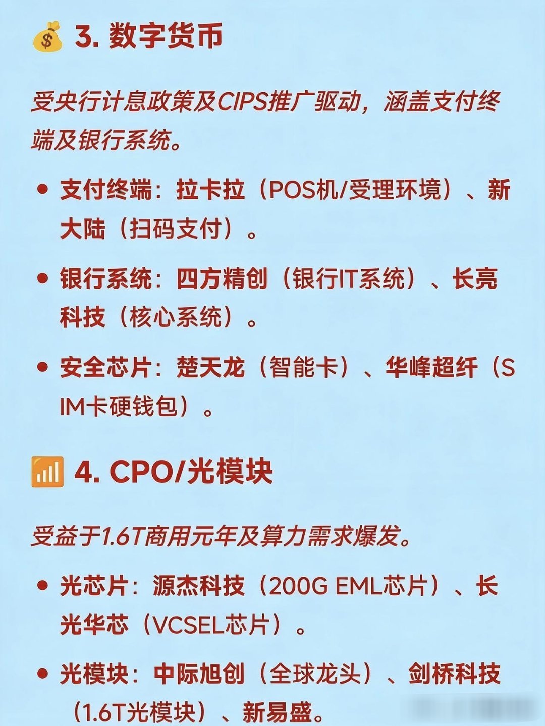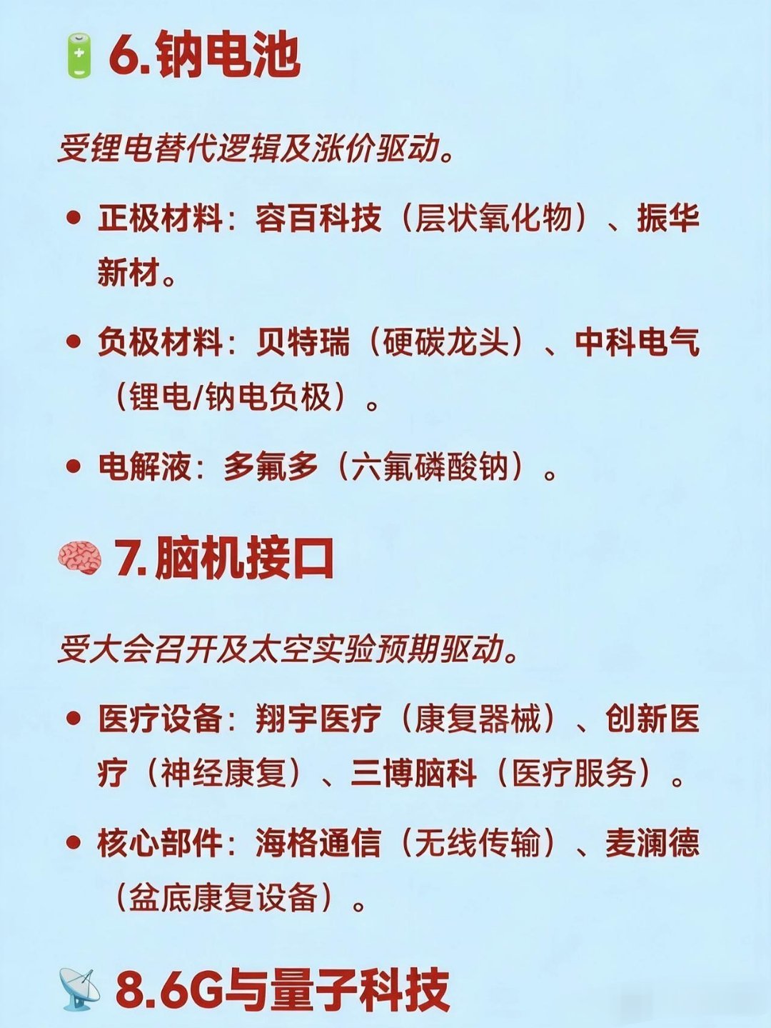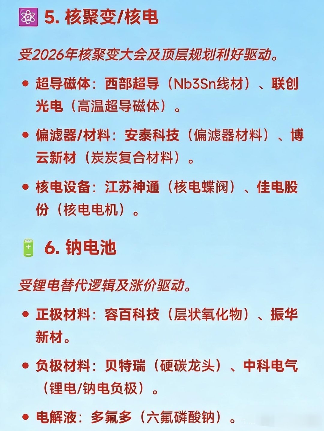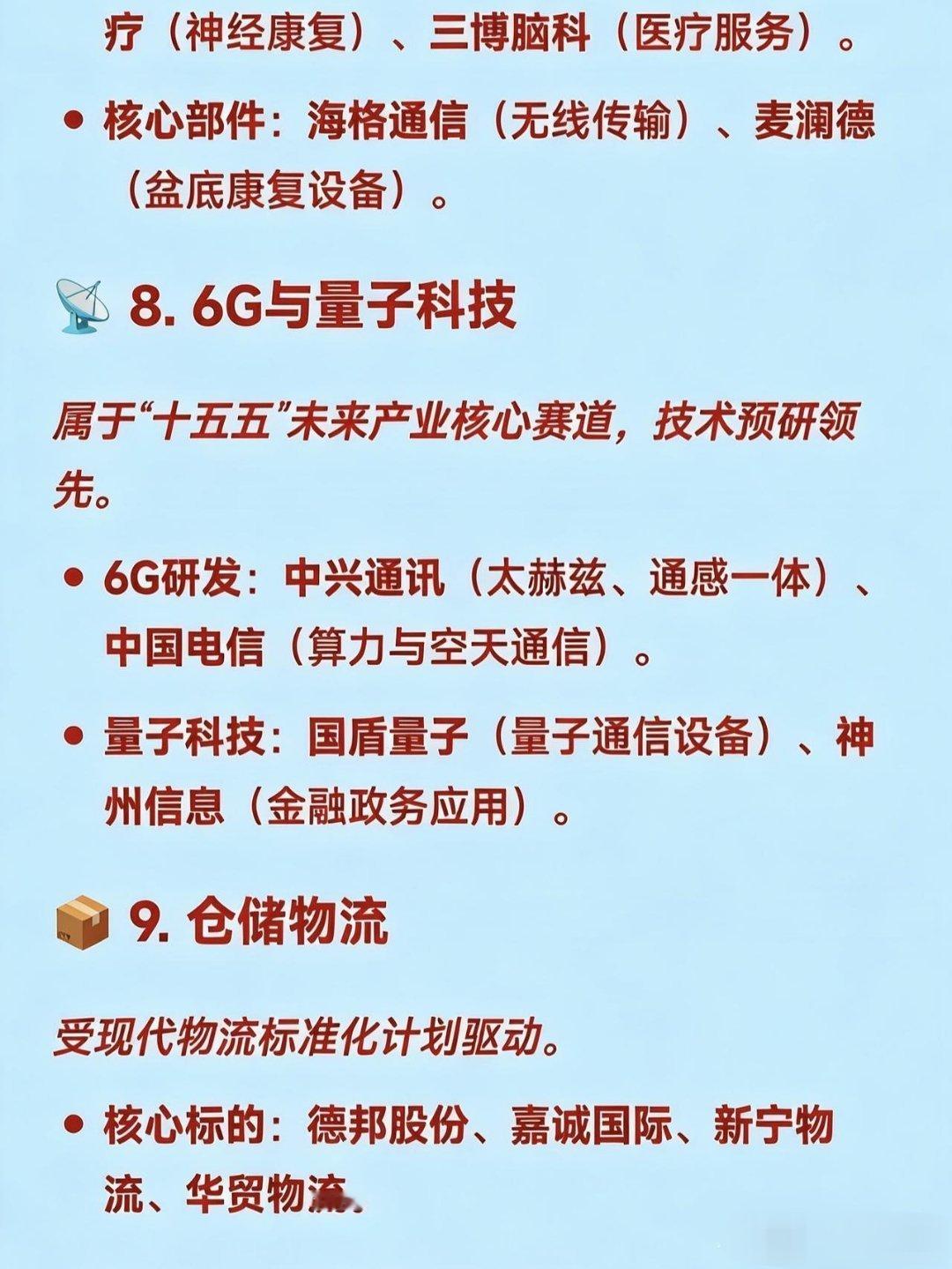 12月30日十大热点概念及产业链龙头梳理🚀1.商业航天受SpaceX上市预期及国内政策支持驱动,涵盖火箭制造、卫星及材料等环节。碳纤维材料:光威复材(军用碳纤维龙头)、中简科技(航天高端碳纤维)、吉林化纤(大丝束原丝)。火箭制造/配套:航天发展(指控通信)、神剑股份(星箭结构件)、雷科防务(星载雷达)。地面设备/卫星:海格通信(卫星导航)、中国卫星(小卫星制造)。🤖2.人形机器人受具身智能门店落地及标准化推进,聚焦核心零部件。减速器:双环传动(精密齿轮)、中大力德(行星/RV减速器)。丝杠/关节:贝斯特(行星滚柱丝杠)、恒立液压(丝杠产线落地)。核心部件:兆威机电(灵巧手核心部件)、隆盛科技(谐波减速器)。💰3.数字货币受央行计息政策及CIPS推广驱动,涵盖支付终端及银行系统。支付终端:拉卡拉(POS机/受理环境)、新大陆(扫码支付)。银行系统:四方精创(银行IT系统)、长亮科技(核心系统)。安全芯片:楚天龙(智能卡)、华峰超纤(SIM卡硬钱包)。📶4.CPO/光模块受益于1.6T商用元年及算力需求爆发。光芯片:源杰科技(200GEML芯片)、长光华芯(VCSEL芯片)。光模块:中际旭创(全球龙头)、剑桥科技(1.6T光模块)、新易盛。连接器:华丰科技(高速背板连接器)。⚛️5.核聚变/核电受2026年核聚变大会及顶层规划利好驱动。超导磁体:西部超导(Nb3Sn线材)、联创光电(高温超导磁体)。偏滤器/材料:安泰科技(偏滤器材料)、博云新材(炭炭复合材料)。核电设备:江苏神通(核电蝶阀)、佳电股份(核电电机)。🔋6.钠电池受锂电替代逻辑及涨价驱动。正极材料:容百科技(层状氧化物)、振华新材。负极材料:贝特瑞(硬碳龙头)、中科电气(锂电/钠电负极)。电解液:多氟多(六氟磷酸钠)。🧠7.脑机接口受大会召开及太空实验预期驱动。医疗设备:翔宇医疗(康复器械)、创新医疗(神经康复)、三博脑科(医疗服务)。核心部件:海格通信(无线传输)、麦澜德(盆底康复设备)。📡8.6G与量子科技属于“十五五”未来产业核心赛道,技术预研领先。6G研发:中兴通讯(太赫兹、通感一体)、中国电信(算力与空天通信)。量子科技:国盾量子(量子通信设备)、神州信息(金融政务应用)。📦9.仓储物流受现代物流标准化计划驱动。核心标的:德邦股份、嘉诚国际、新宁物流、华贸物流。🧶10.碳纤维/被动元件受原材料涨价及需求回暖驱动。被动元件:风华高科(电感/电阻)、顺络电子(功率电感)。碳纤维:光威复材(全产业链)、中复神鹰(高性能碳纤维)、吉林碳谷(原丝)。