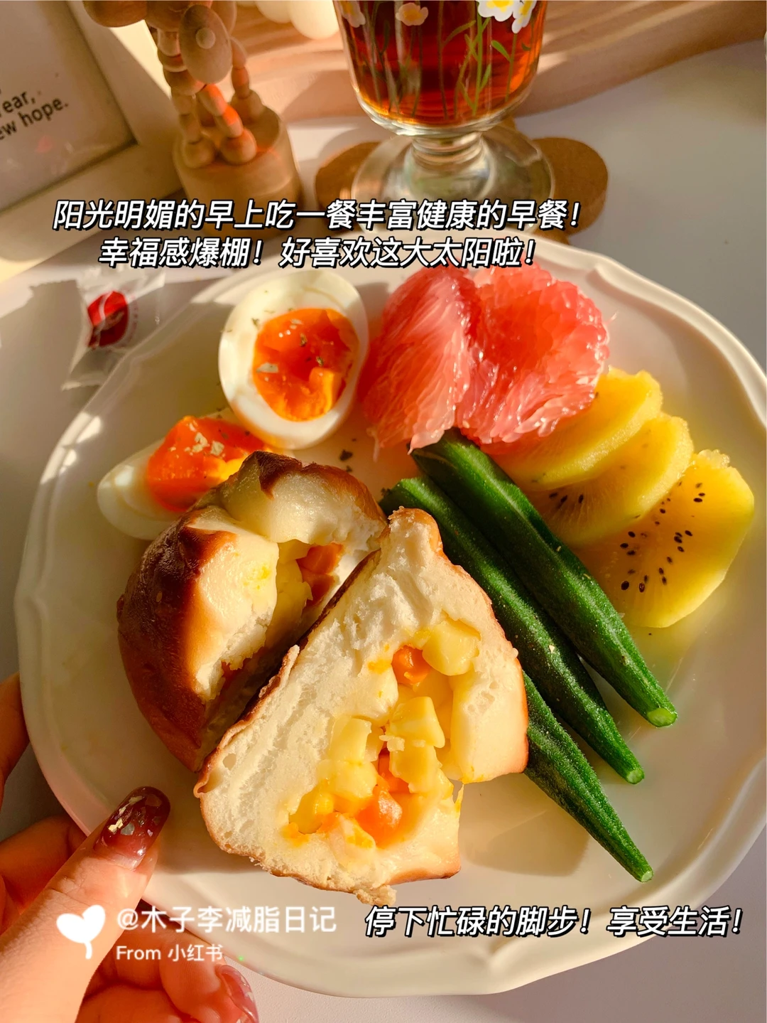 🍳早餐:乳酪碱水➕柚子➕猕猴桃➕普洱茶➕鸡蛋➕红枣糖➕秋葵