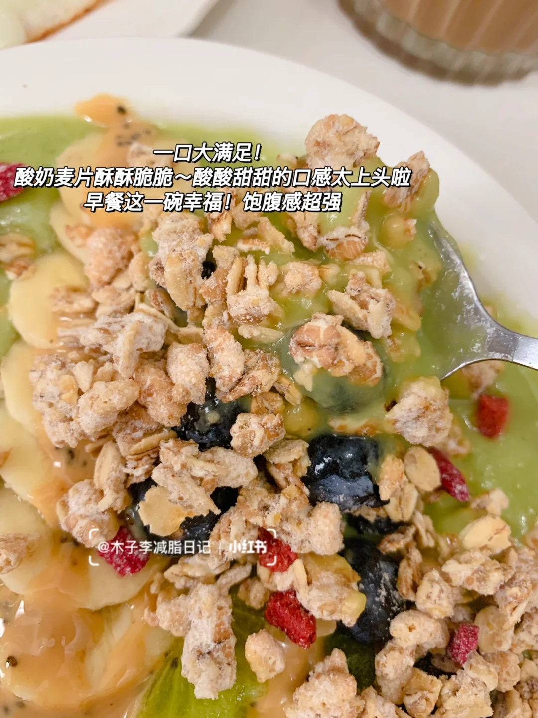 📣:减脂期间我一直都把早餐搭配的营养丰富!早餐吃好能给我们身体提供能量!唤醒一天的新陈代谢!今天的早餐是牛油果🥑香蕉奶昔配上酸奶燕麦片!方便快捷[萌萌哒R]膳食纤维丰富饱腹感贼强!介个酸奶覆盆子口味的麦片别看普普通通的吃着口感就hin惊喜~燕麦颗粒大而饱满~口感脆香脆香的!还有莓果干的酸甜!又不会甜腻~饿了抓一把干吃都行或者拿来泡奶拌酸奶都🉑!你们自己解锁吃法[扯脸H]