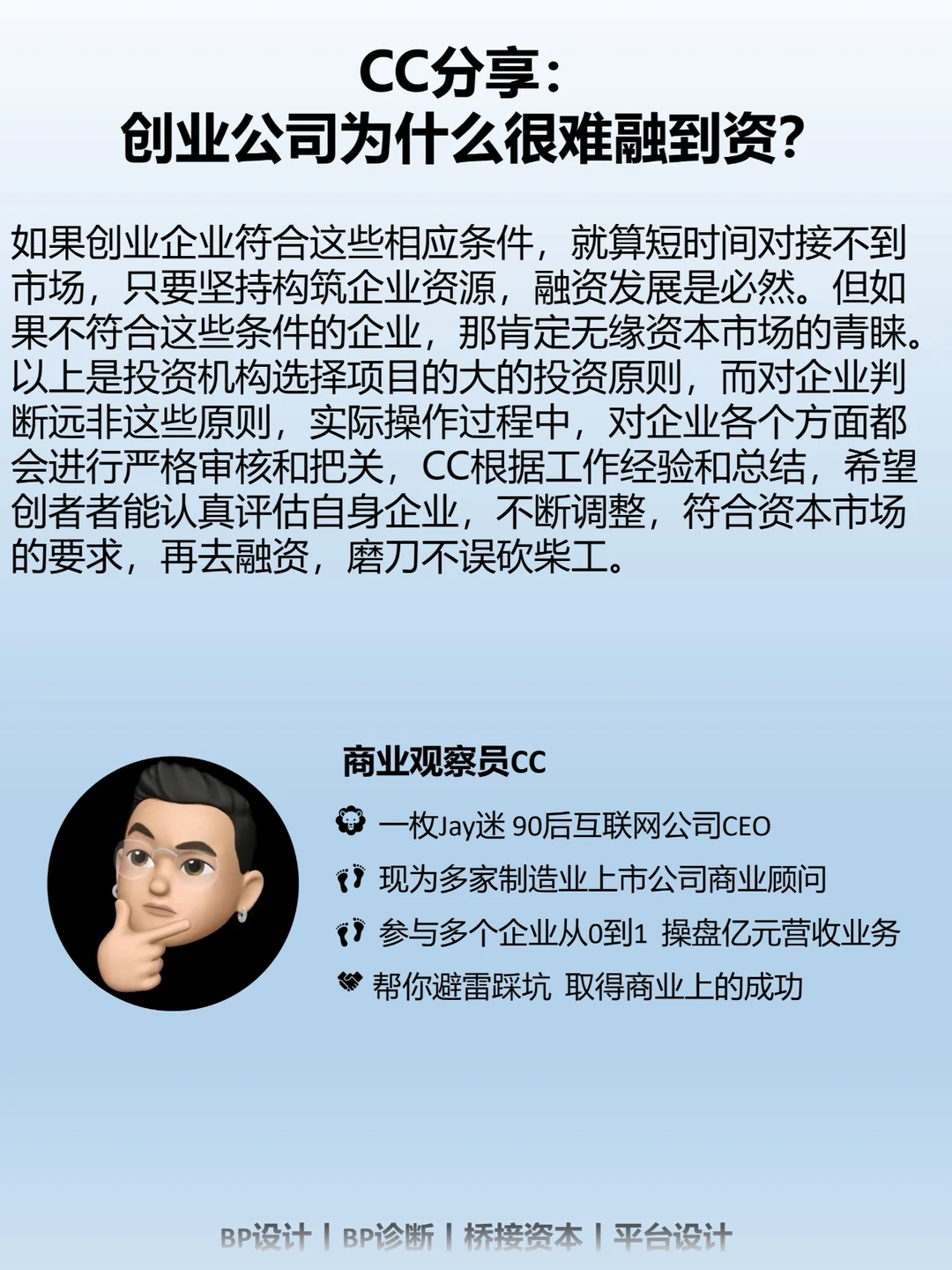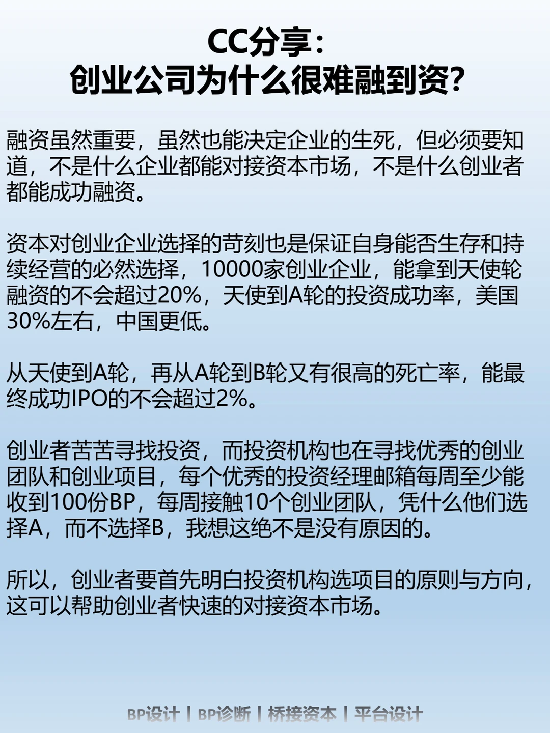 CC根据工作经验和总结,希望创者者能认真评估自身企业,不断调整,符合资本市场的要求,再去融资,磨刀不误砍柴工。