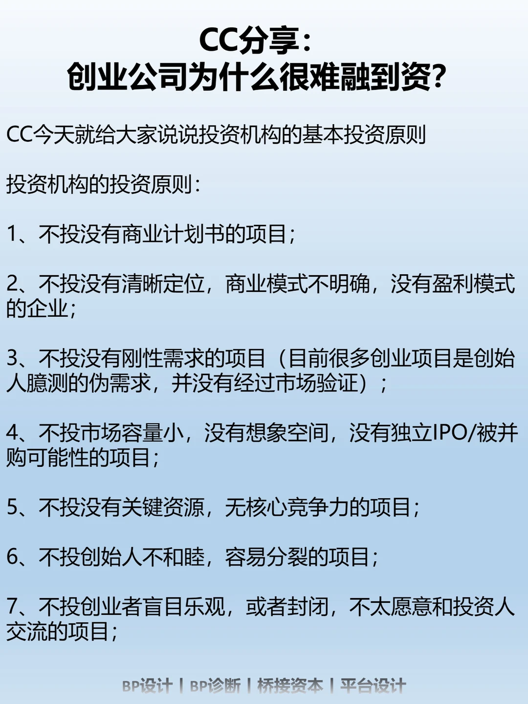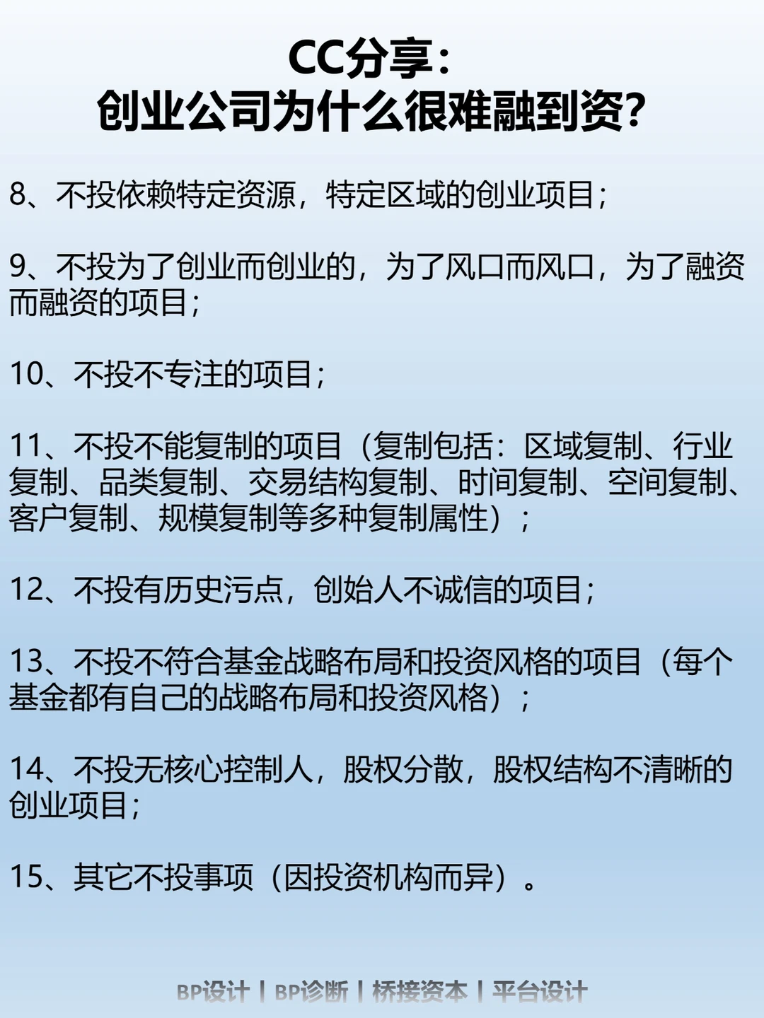 9、不投为了创业而创业的,为了风口而风口,为了融资而融资的项目;