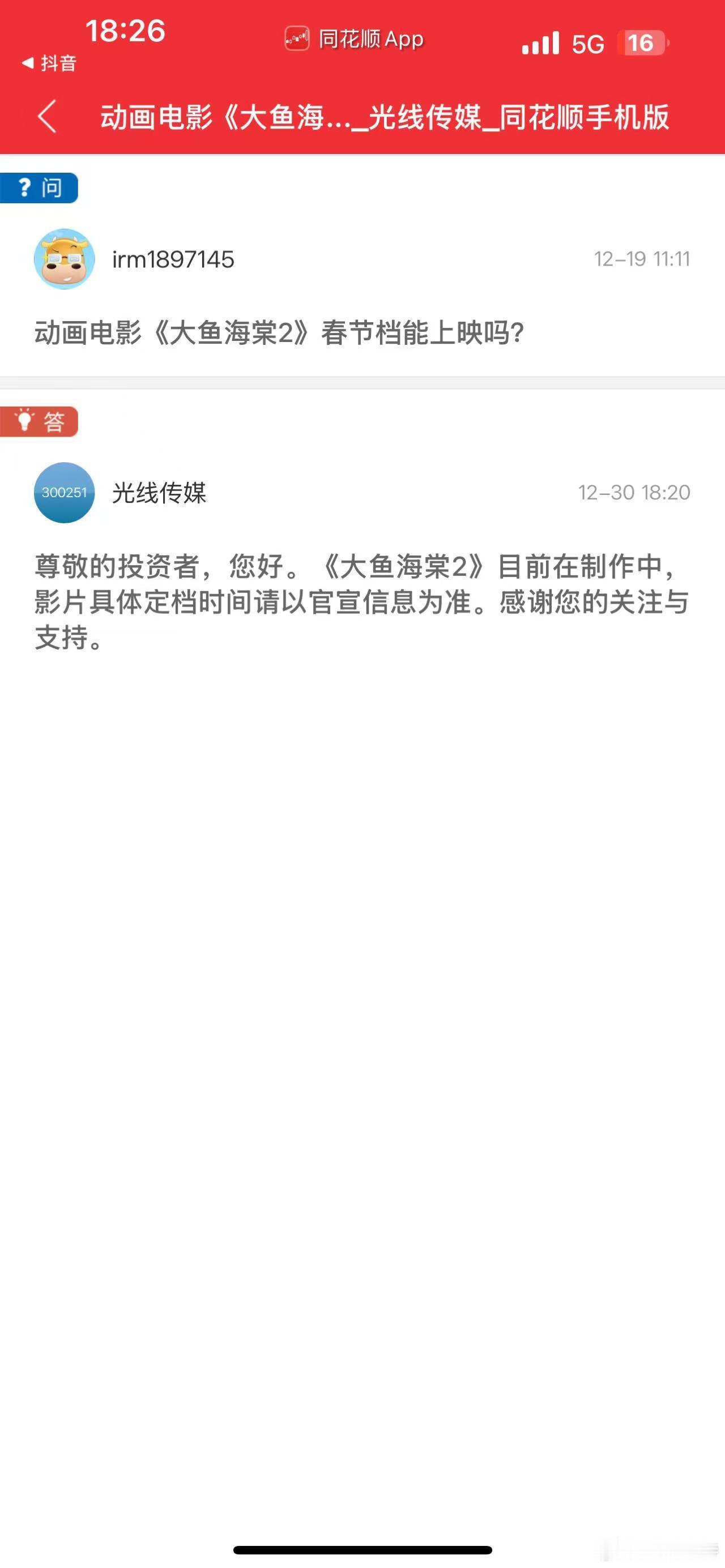 听听温特怎么说 光线传媒:《大鱼海棠2》还在制作中,具体档期以官宣为准。今日有股民在互动平台问《大鱼海棠2》春节能上不,官方回复制作中。