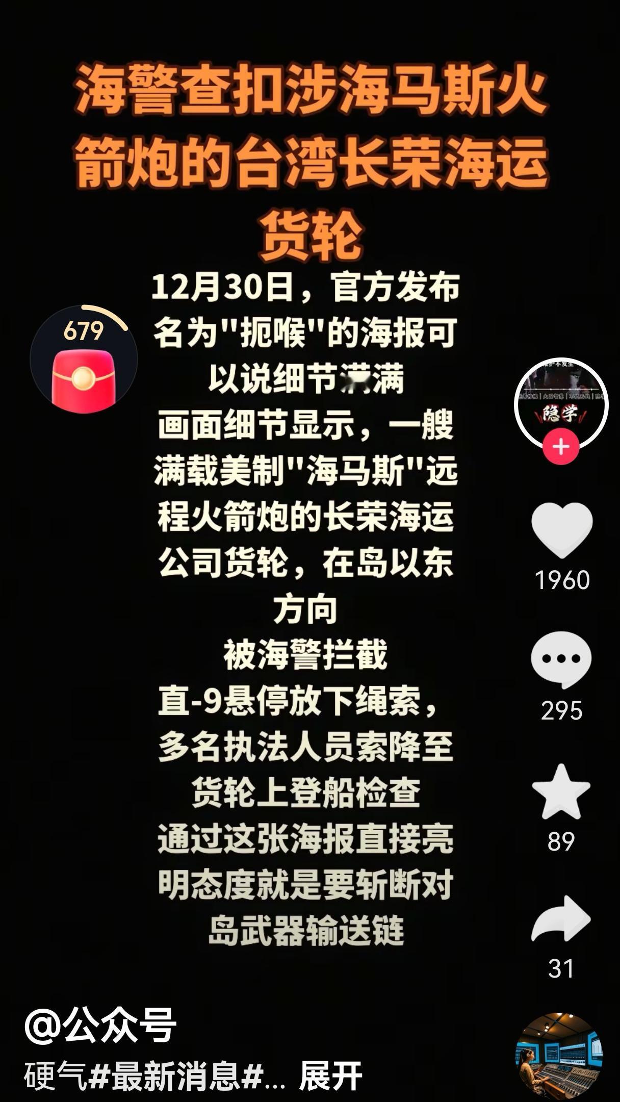 今天晚上,很多自媒体都在报道,说中国海警扣留了一艘载有海马斯导弹系统对象长荣号货轮,还是总共是112套,传的有鼻子有眼。我去查找了一下,这只是12月30日中国海警局与《环球时报》当日发布的主题海报《扼喉》,属于执法威慑宣传,不是真实执法事件报道。大家不要以讹传讹。