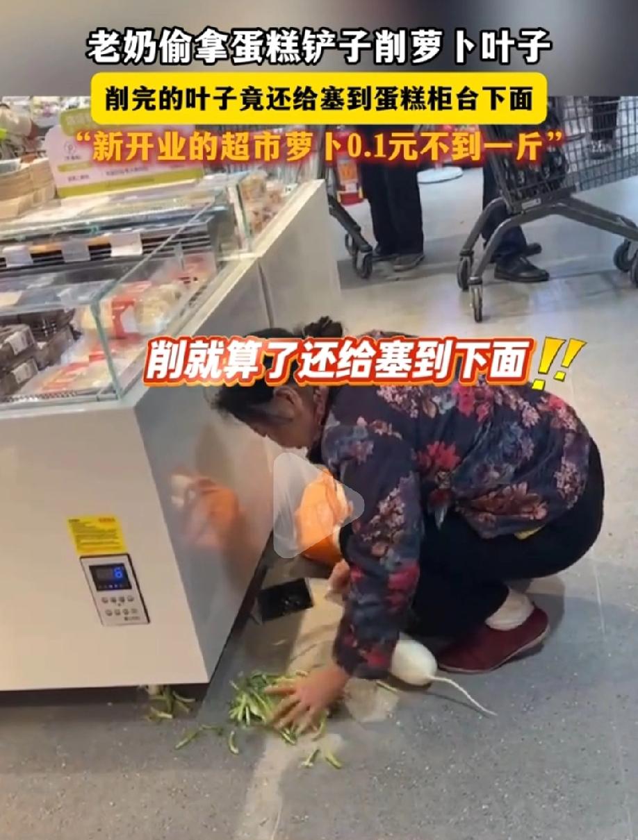 穷不可怕!可怕的是心眼还不正! 一老奶奶去超市里买白萝卜,0.1元一斤的白萝卜,还偷拿蛋糕铲削掉叶子,削完的叶子竟还给塞到蛋糕柜台下面。 真是活不起了!那点绿色叶子,加起来也就1斤的样子,人家新店开业才0.1元一斤。你手掰一点,也就算了,还拿蛋糕铲削,削了还塞蛋糕柜台下面。关键人来人往的,还做到旁若无人,脸皮真厚! 这是录着视频看到了,如果不知道,估计腐烂了发臭了,才能发现。这心眼也太坏了! 关键大家都认为丢人,缺德事情。老奶奶还觉得自己会过日子,有本事,买的萝卜比大家买的质量好,还便宜。人家不觉得是耻辱,反而是炫耀的资本。 建议这种人就应该拉入黑名单,从此不得进入这家超市。
