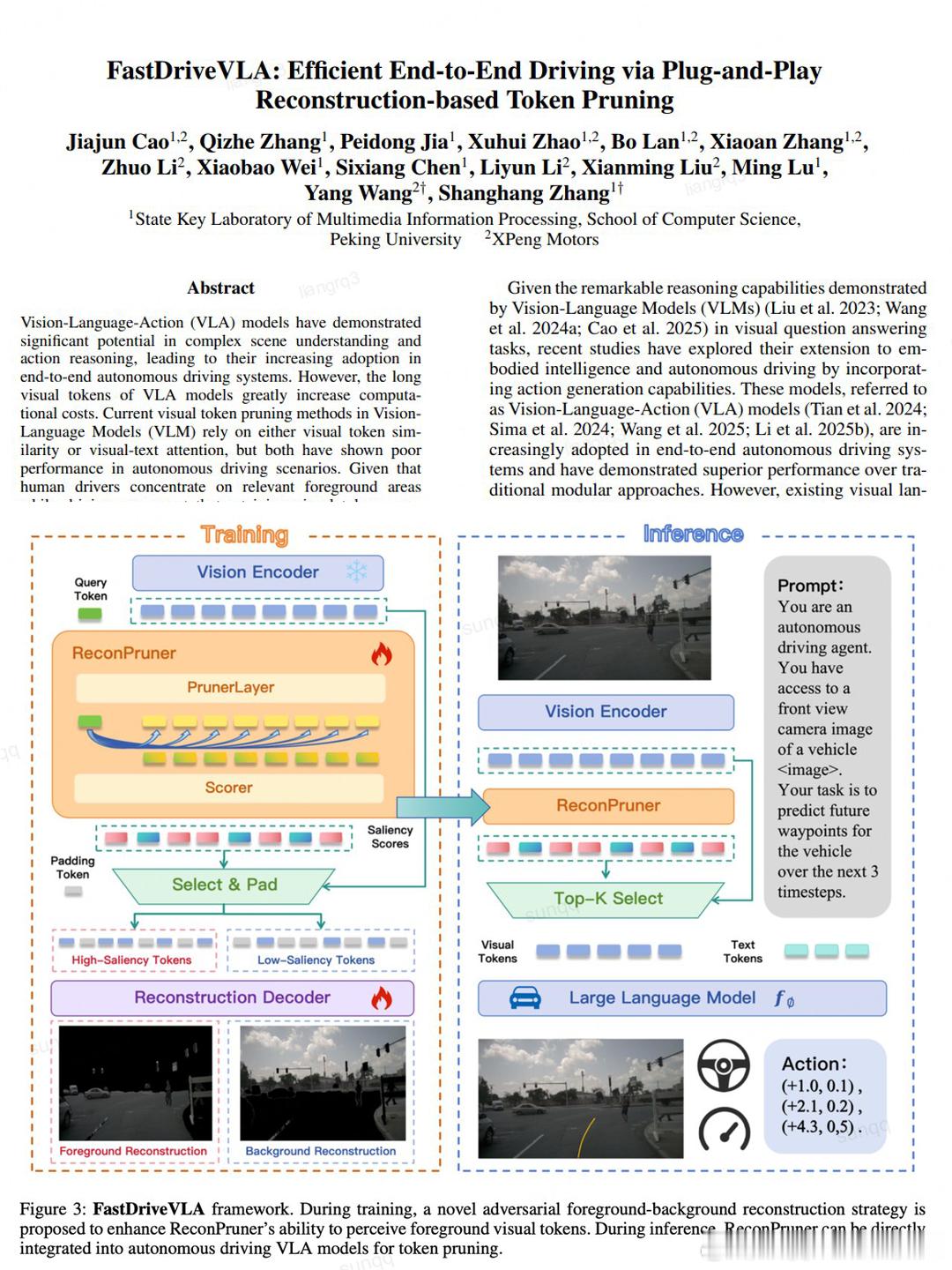 近期自动驾驶圈有个重磅消息,小鹏汽车和北京大学联合研发的成果,成功登上了人工智能顶会AAAI 2026。这次他们搞出的“视觉令牌剪枝(Visual Token Pruning)”框架,看似专业,实则解决了高阶智驾落地的核心痛点,让L4级自动驾驶离我们又近了一大步。先搞懂一个关键问题,为什么非要花大力气做这项技术?现在主流的VLA 2.0智驾模型,本事不小,能直接处理摄像头拍的视觉画面,不用复杂的信号转译,就能直接生成驾驶动作指令,相当于给车装了“直接看路决策”的能力。但问题也很致命:它处理图像时,会把眼前的场景拆成海量“视觉令牌”,就像把一张照片切成几千个小碎片逐个分析。这会让车载电脑不堪重负,计算速度变慢,实时决策跟不上,哪怕技术再先进,也没法真正装到车上用。简单说,不解决这个“算力包袱”,高阶智驾就是纸上谈兵。而小鹏和北大联合研发的FastDriveVLA框架,就是专门给智驾模型“减负”的神器,核心优势藏在“选择性观察”这五个字里。团队从人类开车的习惯里找了灵感,我们开车时只会重点看车辆、行人、红绿灯这些关键信息,不会盯着天空、远处的静止建筑发呆。而这项技术就是让模型学会这种“取舍”。通过专属的视觉令牌剪枝(Visual Token Pruning)框架,精准剔除那些没用的冗余视觉令牌,只保留和驾驶决策相关的关键信息。不用重新训练主模型,就能直接适配现有VLA系统,相当于“即插即用”,落地成本大大降低。更关键的亮点的是,它实现了“效率和精度的双赢”。以往有些技术想降低计算量,难免会牺牲决策准确性,但FastDriveVLA能在把计算量减少7.5倍、推理速度提升3倍多的同时,核心驾驶指标还优于未剪枝的模型。这种“减负不降级”的能力,正是行业里稀缺的关键突破。另外提一句,理想汽车也在做同款 VLA 智驾技术,自研了 MindVLA 框架,核心也是想让智驾模型更高效、更好上车,只是技术路子不一样。理想靠 MoE 混合架构、稀疏注意力等方式轻量化模型,暂时没用到小鹏这种「视觉令牌剪枝」的方法,算是同目标、不同解法。总之,小鹏这次成果被AAAI 2026收录,也意味着这项技术得到了国际学术界的权威认可。对用户来说,这背后是L4级自动驾驶规模化落地的加速,未来能享受到更安全、更流畅的智能驾驶体验。大v聊车