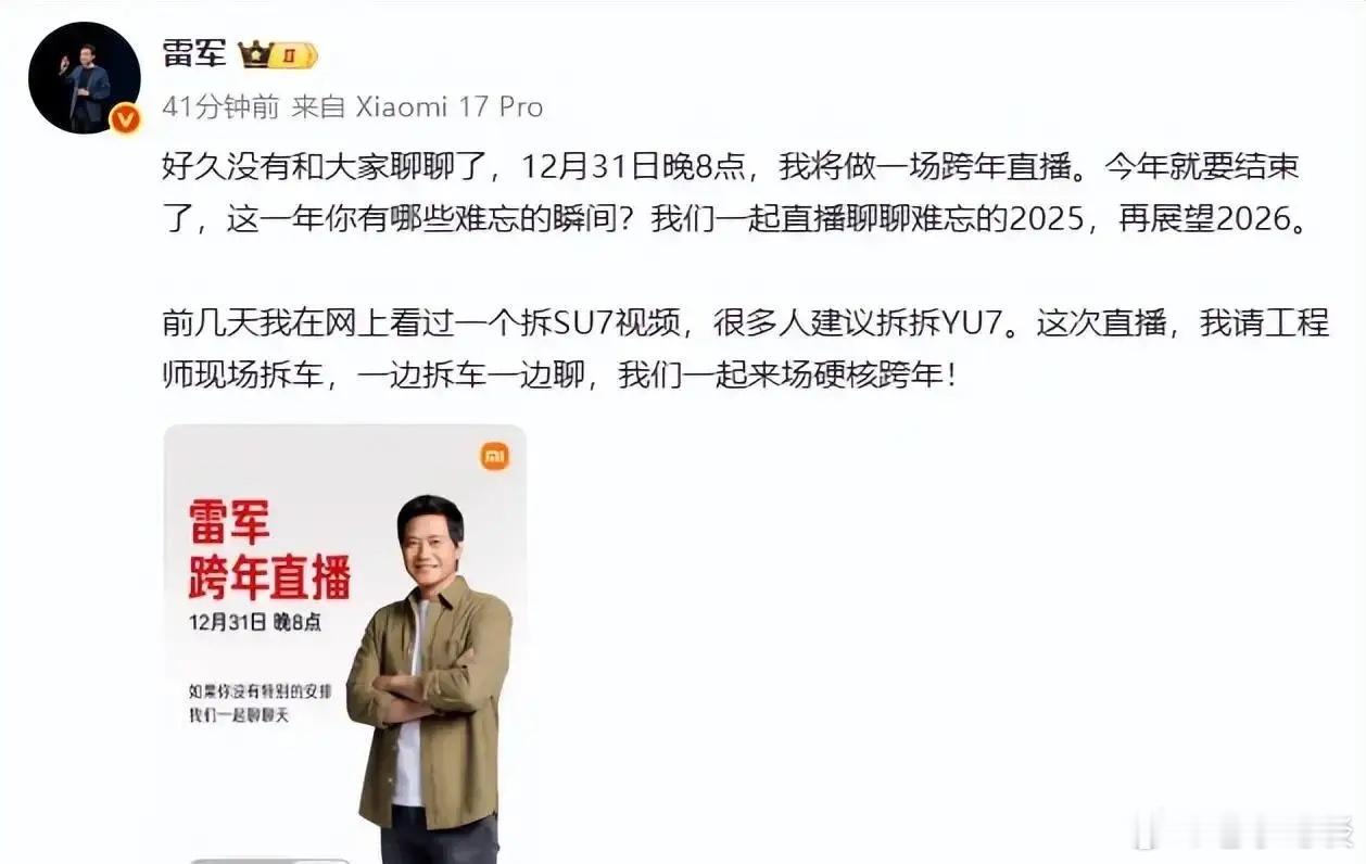 快讯!雷军突然宣布了。小米创办人、董事长兼CEO雷军定于12月31日20:00开启跨年直播,在其社交平台发声将以“现场拆车+对谈”形式,与工程师边拆边聊,直接回应用户对新车细节与对比的关切,最直接的结果是话题集中度与用户触达在年末窗口被拉到高位。当下的直接推手在于,年末流量与销售节点叠加,“拆车”内容在车圈持续走红,舆论与转化之间存在可利用的窗口期。之所以此时踩了油门,是因为直播能把技术解释权收回到官方手里,减少外部解读的糊涂账。回头看,过去两个月汽车直播密集,价格战加速,交付爬坡。用户对安全、续航、做工的追问,把品牌的手脚推上“公开答卷”的台前。落到地面上,消费者的账本很直观:冬季用车续航打折,服务区充电桩排队成常态;门店周末试驾要排号,热门配置等待周期拉长;新车型保险费率、维修网点覆盖、二手保值率还没跑出基本盘;分期月供与年终奖到手时间错位,现金流压力真切。对销售一线,月末指标压顶,直播带来的线索转化与退订率,是最现实的KPI拉扯。往深里看,这是小米一贯的路数——硬件+互联网+粉丝运营,把工程叙事前移,通过“可解释性”稳住信任的基本盘。造车新势力也有路径依赖:创始人亲自下场,用个人IP当筹码。放进国家的路数里看,工程师红利与供应链协同是底层逻辑,公开透明有助于确立“规矩”,但也要守住商业机密与合规的红线、底线。这些年互联网直播的教训在前,流量与专业的边界管不好就会反噬。各方立场开始表态,一边是支持者认为“拆车见真章”,能压实做工与安全细节,倒逼行业提质;另一边则担忧“舞台化拆车”样本选择不具代表性,容易避重就轻,引发友商口水战和专利争议。供应链更看重被点名与否,媒体则盯着是否触碰广告与数据合规红线。官方对此保持谨慎口径,强调直播聚焦技术交流与安全合规,不涉及商业机密。从宏观盘面看,好处是直播集中流量,强化透明与信任,带动线索、提升品牌势能,并为供应链伙伴增添筹码。但代价是暴露短板的风险增大,公关与法务压力上升,工程团队被迫兼顾营销节奏,形成资源掣肘。矛盾就出在技术公开与商业机密的边界、工程节奏与营销节奏的不一致,一旦拿捏失衡,既伤研发,又难转化。短期看,直播热度高企,线索与订单有望小幅抬升,友商可能跟进对比评测,话语权之争延续1-2周,监管对直播内容、广告合规与数据安全的关注度提升。局内人建议:提前设定“可讲/不可讲”的边界清单,技术问答与售后承诺成对发布,准备应急澄清与法务预案;渠道端以试驾与交付能力兜底转化;投资者盯三项KPI——直播转化率、1月交付节奏、退订与售后投诉曲线