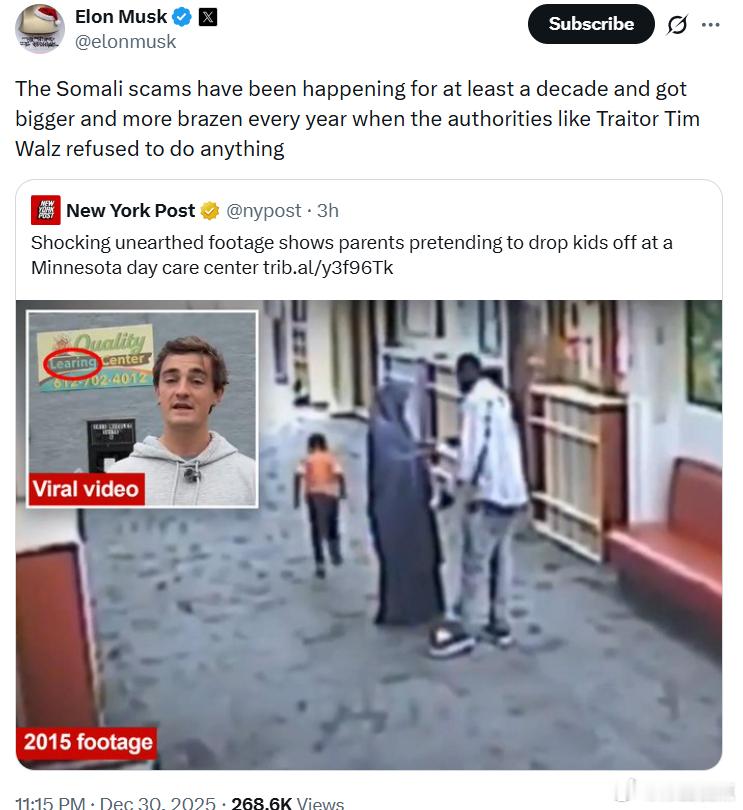 马斯克:这些索马里人的诈骗行为至少已经持续了十年。而当像“叛徒”蒂姆·沃尔兹这样的当权者拒绝采取任何行动时,这些骗局一年比一年规模更大、手段更嚣张。