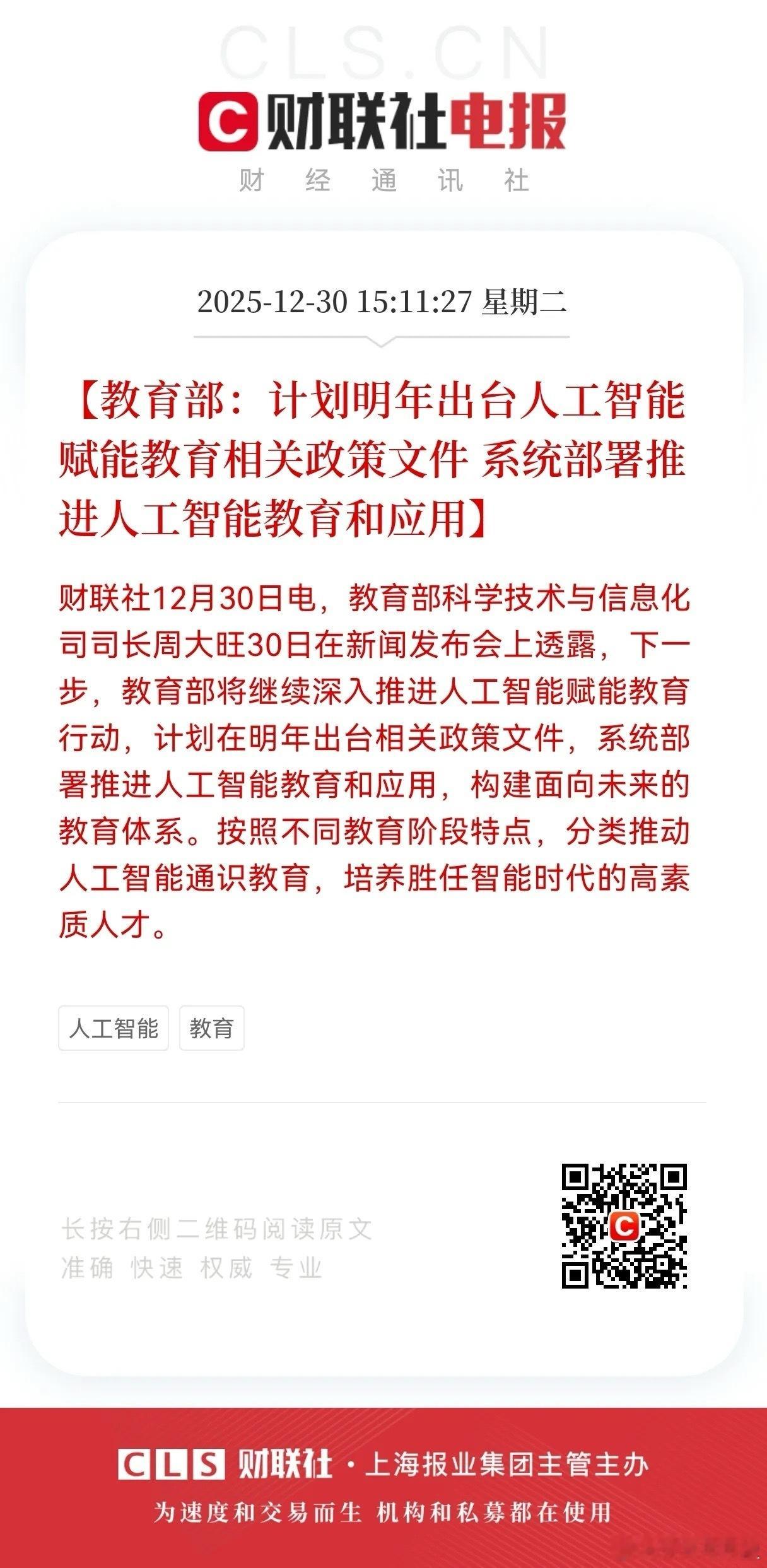 突发!教育部要出AI新政!这个赛道要火?教育部官宣2026年要出台人工智能政策,还要分学段推AI通识教育,从小学兴趣启蒙到高中创新实践,把AI素养当基础能力来培养,这力度绝了!我觉得这波不是虚炒概念,政策已经明确要让AI融入教学全流程,还建了教育专用大模型和AI工具“白名单”,既防过度依赖又保安全。对投资者来说,教育信息化、AI课程内容这些方向实打实受益,但得盯有落地产品、合规性强的企业,纯蹭热点的可别碰。
