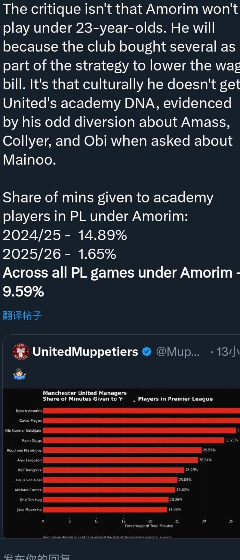 著名御林军muppet发了一个数据统计:在使用u23球员的时长比例看,阿莫林高居第一。他发这个自然是为了驳斥阿莫林不爱使用年轻球员的批评。但很快青训博主们发现了华点,阿莫林使用u23的比例如此之高是因为英力士购买了大量年轻球员。但实际阿莫林在对曼联青训的使用这个赛季降到了极低的水平。仅1.6%
