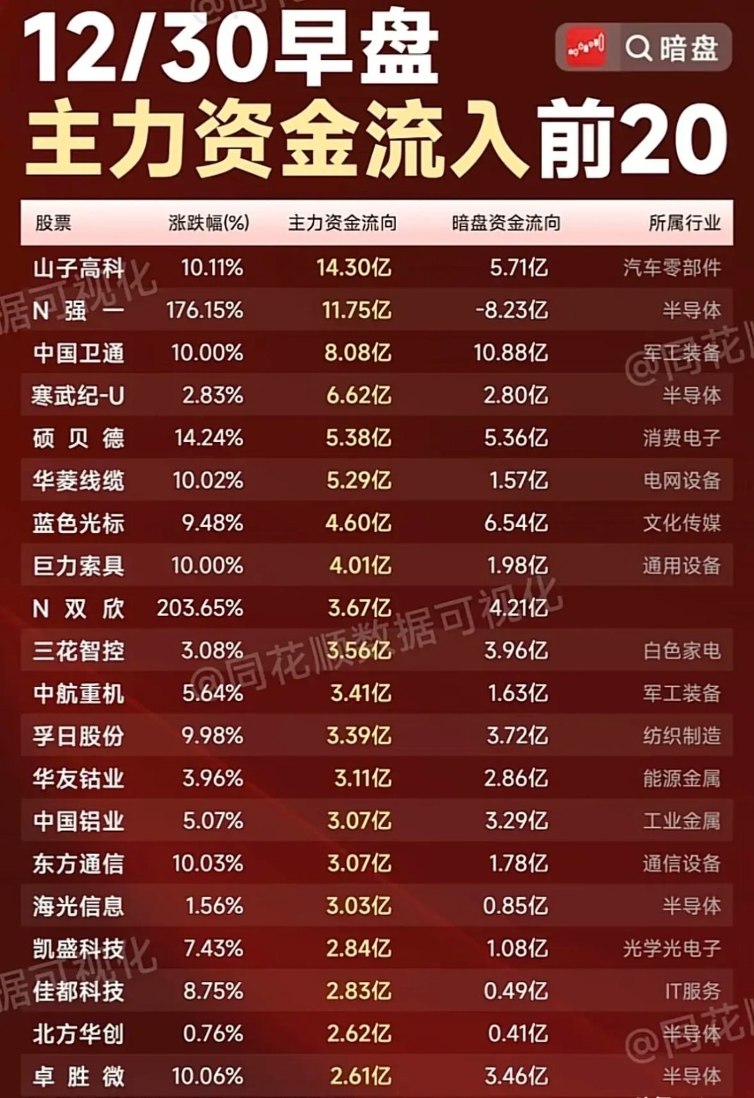 今日主力及暗盘资金流入TOP20个股全梳理与解析本次梳理囊括汽车零部件、半导体、军工装备等十余大行业,两只新股表现亮眼,N强一、N双欣首日涨幅分别高达176.15%、203.65%,榜单内多只个股强势涨停。半导体板块标的在榜单中占比领先,暗盘资金流向呈现明显分化,部分个股暗盘流入规模反超主力,而N强一则出现暗盘资金大额出逃的情况。个股详细梳理与解析1. 山子高科:涨幅10.11%逼近涨停,隶属汽车零部件行业,主力资金流入14.30亿登顶榜单,暗盘资金流入5.71亿。该股是当日主力资金的头号聚焦标的,资金布局力度远超其余个股,成为全场资金关注度榜首。2. N强一:半导体行业新股,首日大涨176.15%,主力资金流入11.75亿,暗盘资金却大幅流出8.23亿。个股首日涨幅亮眼,但资金分歧尤为剧烈,形成主力大举进场、暗盘资金获利出逃的鲜明对立格局。3. 中国卫通:军工装备板块标的,强势涨停(10.00%),主力流入8.08亿,暗盘流入10.88亿实现反超。市场对其军工核心属性认可度拉满,即便涨停封板,资金仍在持续加码,暗盘资金进场意愿更为积极。4. 寒武纪-U:半导体板块标的,涨幅2.83%表现温和,主力资金流入6.62亿,暗盘流入2.80亿。半导体赛道的核心吸引力凸显,主力资金大额重仓布局,反观暗盘资金则持保守跟进态度。5. 硕贝德:消费电子板块标的,大涨14.24%,主力流入5.38亿,暗盘流入5.36亿近乎持平。消费电子细分赛道热度显现,主力与暗盘资金形成共识,同步发力布局,推动股价大幅走高。6. 华菱线缆:电网设备行业个股,涨幅10.02%接近涨停,主力流入5.29亿,暗盘仅流入1.57亿。主力资金是推动股价冲高的绝对核心,暗盘资金跟进意愿不足,全程由主力主导股价走势。7. 蓝色光标:文化传媒板块标的,涨幅9.48%逼近涨停,主力流入4.60亿,暗盘流入6.54亿反超主力。文化传媒细分赛道获暗盘资金重点青睐,资金进场力度远超主力,助力个股强势冲高。8. 巨力索具:通用设备行业个股,强势涨停(10.00%),主力流入4.01亿,暗盘流入1.98亿仅为前者一半。涨停行情完全由主力资金主导撬动,暗盘资金参与度有限,资金布局集中度高。9. N双欣:未标注所属行业新股,以203.65%的涨幅成为榜单涨幅冠军,主力流入3.67亿,暗盘流入4.21亿略胜一筹。新股首日走出极端涨幅,暗盘资金在博弈中更为主动,进场积极性超过主力。10. 三花智控:白色家电板块标的,涨幅3.08%走势平稳,主力流入3.56亿,暗盘流入3.96亿小幅反超。家电细分领域优质标的获资金持续关注,暗盘资金进场意愿略强于主力,形成稳健布局态势。11. 中航重机:军工装备板块标的,涨幅5.64%,主力流入3.41亿,暗盘流入1.63亿。作为军工赛道的核心标的之一,股价上涨由主力资金主导,暗盘资金跟进力度疲软,整体走势平稳。12. 孚日股份:纺织制造板块标的,涨幅9.98%逼近涨停,主力流入3.39亿,暗盘流入3.72亿实现反超。纺织制造赛道标的收获暗盘资金额外加持,资金进场力度领先主力,助推个股近乎封板。13. 华友钴业:能源金属板块标的,涨幅3.96%,主力流入3.11亿,暗盘流入2.86亿差距甚微。能源金属赛道具备稳健吸引力,主力与暗盘资金布局节奏同步,共同推动个股温和走高。14. 中国铝业:工业金属龙头标的,涨幅5.07%,主力流入3.07亿,暗盘流入3.29亿小幅反超。工业金属核心标的获双路资金同步布局,暗盘进场稍显积极,股价实现平稳上涨。15. 东方通信:通信设备板块标的,涨幅10.03%强势涨停,主力流入3.07亿,暗盘流入1.78亿。涨停行情由主力资金全程主导,暗盘资金参与意愿偏低,资金布局呈现单边聚焦态势。16. 海光信息:半导体板块标的,以1.56%的涨幅成为榜单涨幅末位,主力流入3.03亿,暗盘仅流入0.85亿。尽管个股涨幅微弱,但主力资金依旧坚定大额布局,凸显半导体赛道的长期吸引力,暗盘资金则观望情绪浓厚。17. 凯盛科技:光学光电子板块标的,涨幅7.43%,主力流入2.84亿,暗盘流入1.08亿。主力资金是推动股价上行的核心力量,暗盘资金跟进乏力,光学光电子细分赛道获主力单独重仓。18. 佳都科技:IT服务板块标的,涨幅8.75%,主力流入2.83亿,暗盘流入0.49亿近乎忽略不计。该股获主力资金单边加码布局,暗盘资金参与度极低,资金布局集中度极强。19. 北方华创:半导体核心标的,涨幅0.76%,主力流入2.62亿,暗盘流入0.41亿。即便涨幅微弱,主力仍对这一半导体龙头坚定加仓,足见赛道核心地位,暗盘资金则鲜有进场。20. 卓胜微:半导体细分龙头,涨幅10.06%强势涨停,主力流入2.61亿,暗盘流入3.46亿反超主力。半导体优质龙头收获资金合力追捧,涨停之下暗盘资金进场更为积极,成为助推股价封板的重要力量。行情总结今日上榜的主力资金流入前20个股,呈现行业分布多元但半导体板块占比突出的格局;新股首日涨幅极端,资金分歧尤为显著,涨停标的均获主力重点布局,暗盘资金流向分化明显。与此同时,军工、消费电子等热门赛道亦有核心标的斩获资金青睐,整体来看,市场资金主要围绕热门赛道核心股与新股展开博弈,情绪整体偏向题材炒作与新股博弈两大主线。
