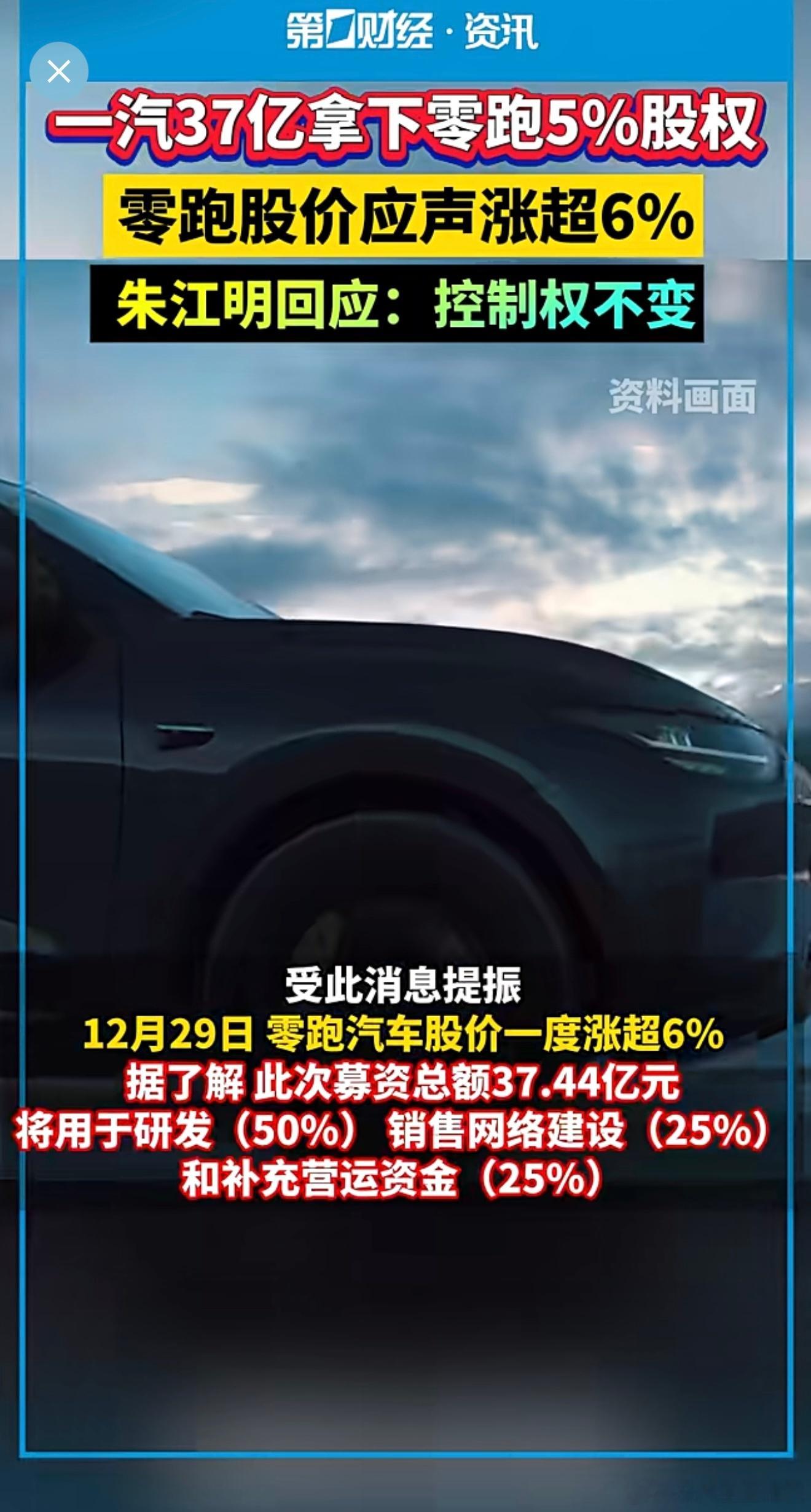 一汽37亿换了零跑5%股权!国资下场是不一样啊,股价都跟着涨了。CEO朱江明说的“控制权不变”,你们觉得会受影响吗?