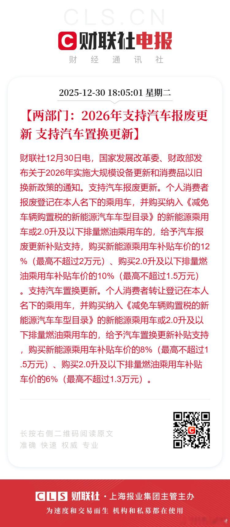 2026年新的报废更新政策出来了,和2025年主要差距如下:1. 补贴计算逻辑改变:2025年为固定金额补贴,无论新车价格高低,符合条件即按统一数额发放;2026年改为车价比例+金额上限的组合模式,补贴金额与新车价格挂钩。2. 旧车门槛放宽:2025年对可报废/置换的旧车有严格的注册年限、排放标准限制;2026年仅要求旧车登记在个人名下,无额外年限/排放要求。3. 小型新能源车套利空间压缩:2025年小型低价新能源车(如售价10万元的车型)可直接拿2万元固定补贴,补贴占比达20%;2026年同车型按12%比例仅能获1.2万元补贴(远低于上限2万元),低价新能源车的补贴收益大幅降低,确实不存在大额套利的空间。而中高端新能源车(售价超16.67万元)仍能拿到2万元最高补贴,与2025年持平。